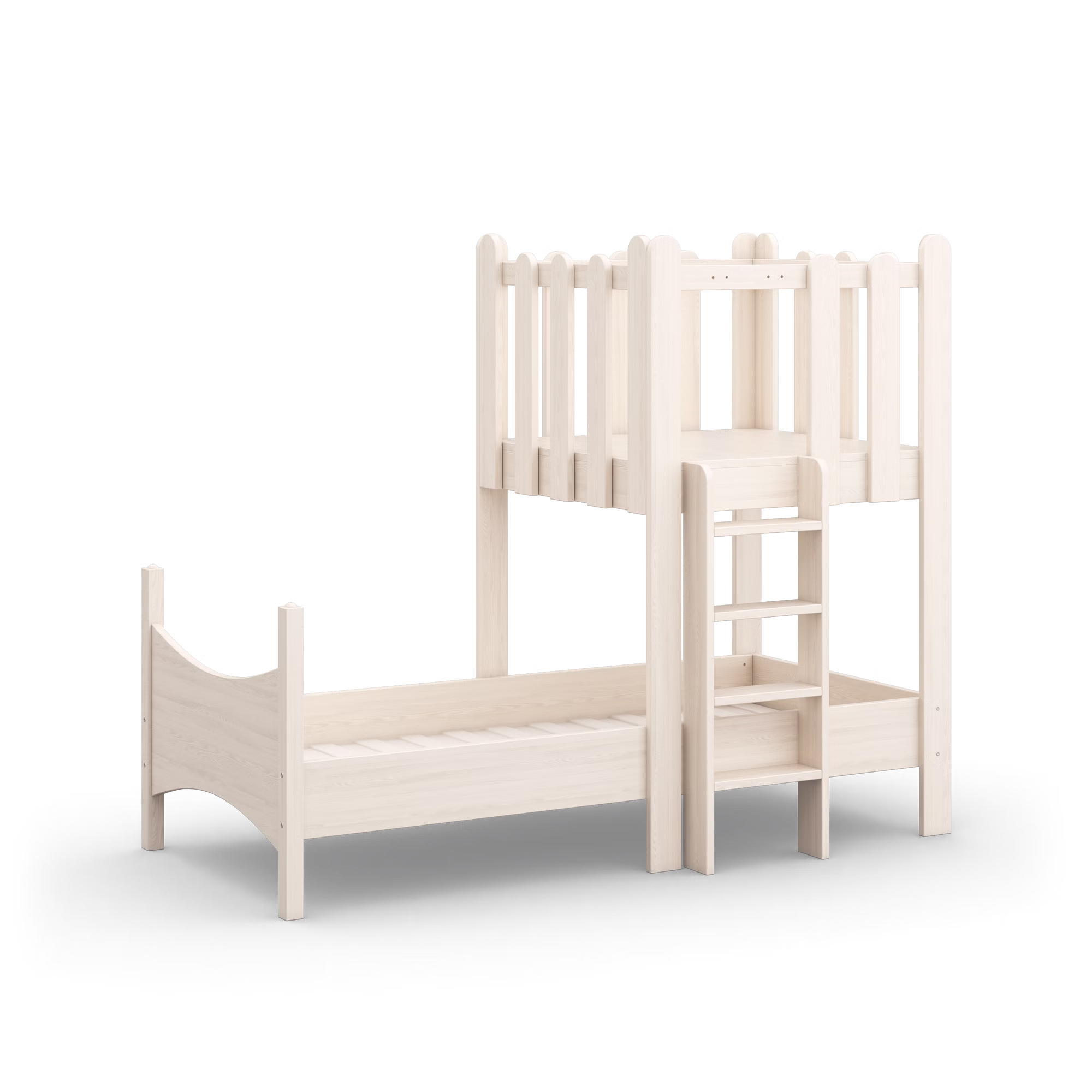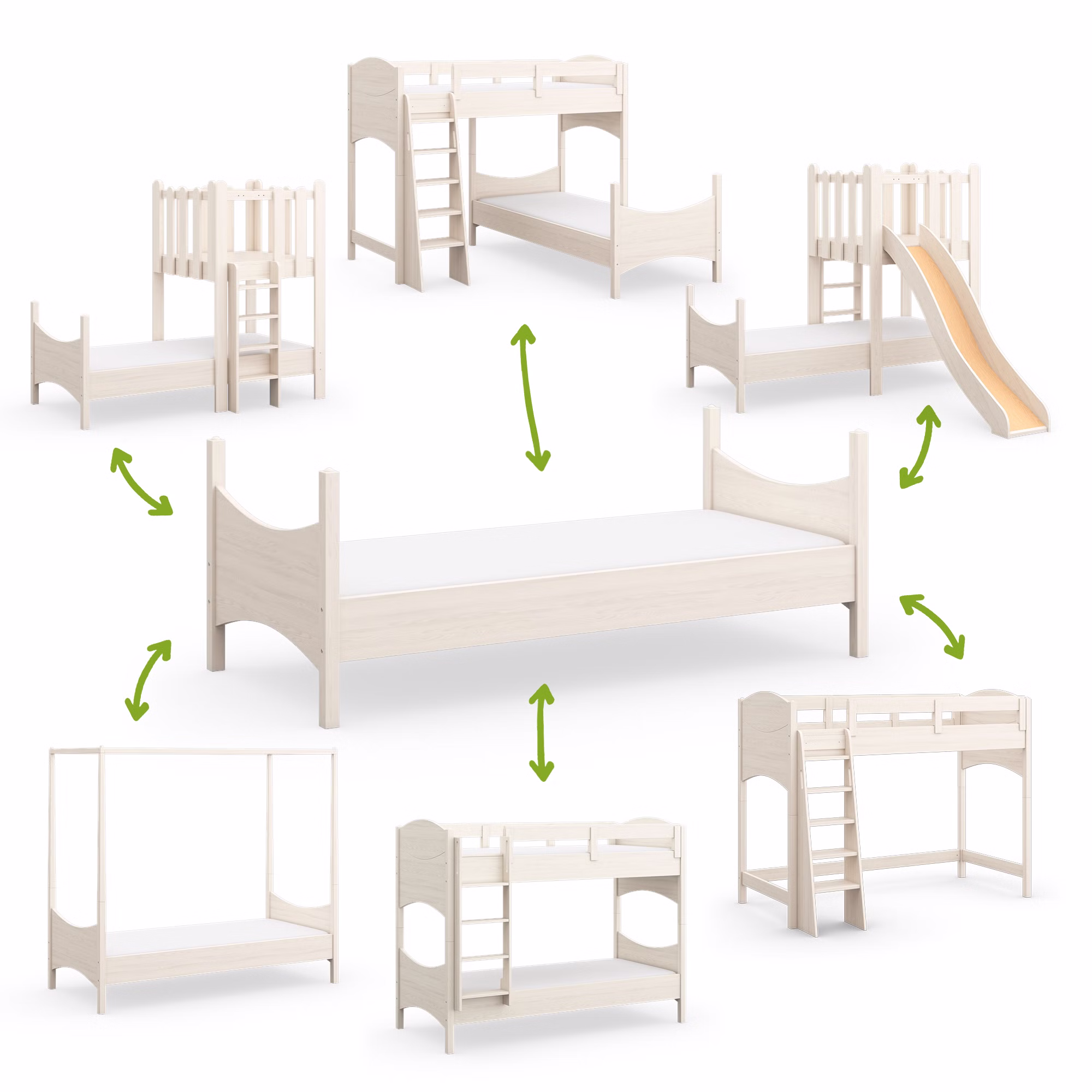 Mit dem Noah Komplett-Set mit Spielturm wird das Kinderzimmer zum tollen Indoor-Spielplatz. Das Bett und der Turm sind aus massivem Bio-Massivholz. Der Spielturm wird sicher und stabil mit dem Bett verbunden und verwandelt das Bett in ein Abenteuerbett, in dem man von tollen Abenteuern träumen kann. Später kann das Bett zu einem frei stehenden Einzelbett oder mit weiteren Elementen zu einem Himmelbett umgebaut werden und ist somit sehr wandelbar.