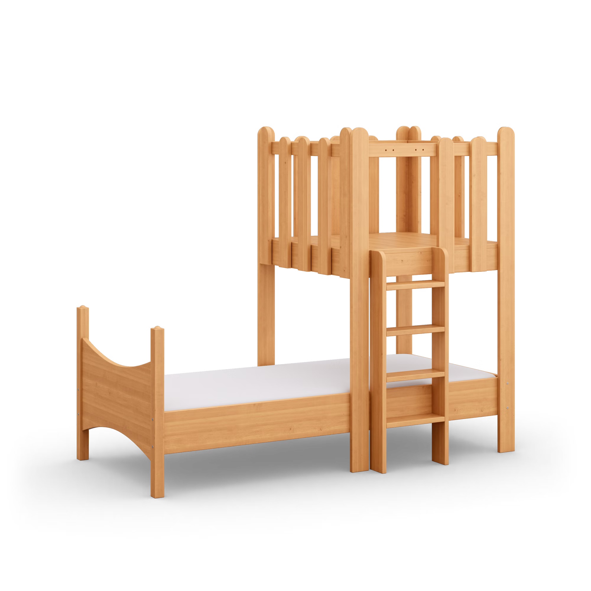 Mit dem Noah Komplett-Set mit Spielturm wird das Kinderzimmer zum tollen Indoor-Spielplatz. Das Bett und der Turm sind aus massivem Bio-Massivholz. Der Spielturm wird sicher und stabil mit dem Bett verbunden und verwandelt das Bett in ein Abenteuerbett, in dem man von tollen Abenteuern träumen kann. Später kann das Bett zu einem frei stehenden Einzelbett oder mit weiteren Elementen zu einem Himmelbett umgebaut werden und ist somit sehr wandelbar.