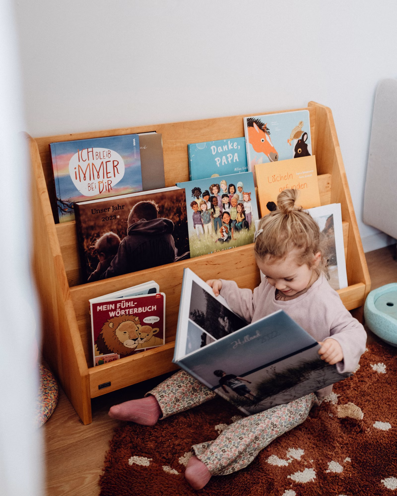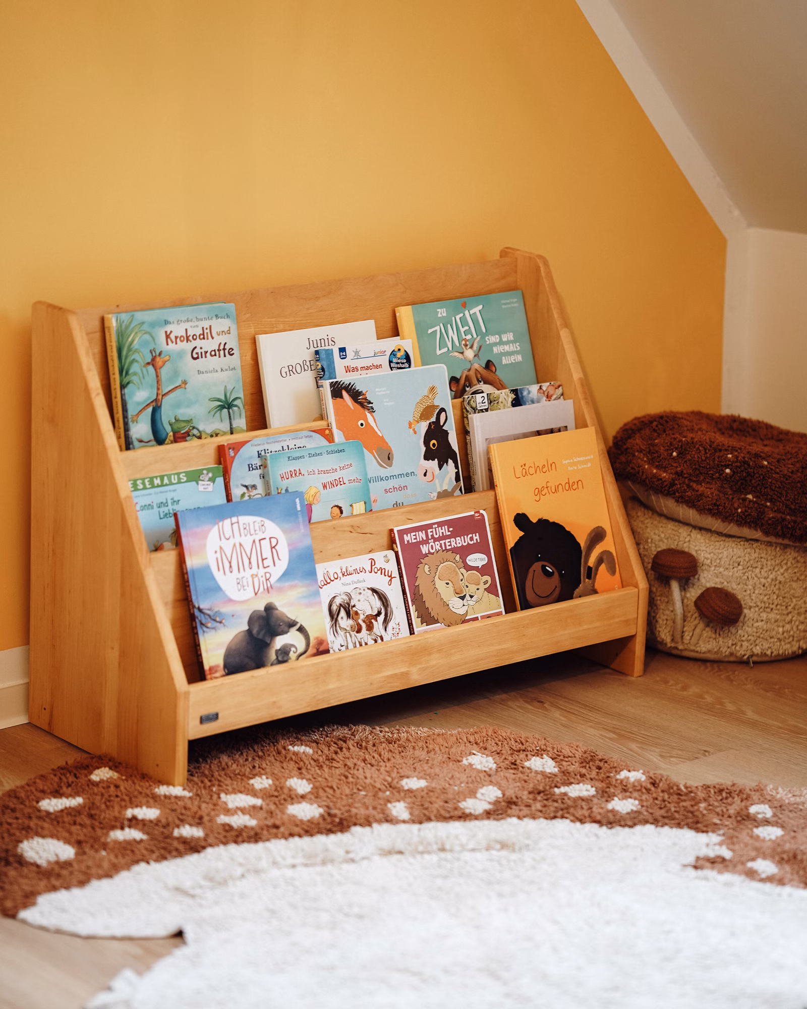 Das Robin Bücherregal kompakt ist eine wunderbare Lösung für Kindertagesstätten ebenso wie für den Einsatz zu Hause. Gefertigt aus nachhaltigem Massivholz, lässt es sich frei im Raum platzieren – ideal zum Spielen und Stöbern. Auf der Vorderseite laden großzügige Fächer dazu ein, Bücher aller Größen mit dem Cover nach vorne zu präsentieren – perfekt, um Kinder zum Entdecken, Auswählen und gemeinsamen Lesen zu motivieren. Selbst großformatige Wimmelbücher finden hier mühelos ihren Platz.