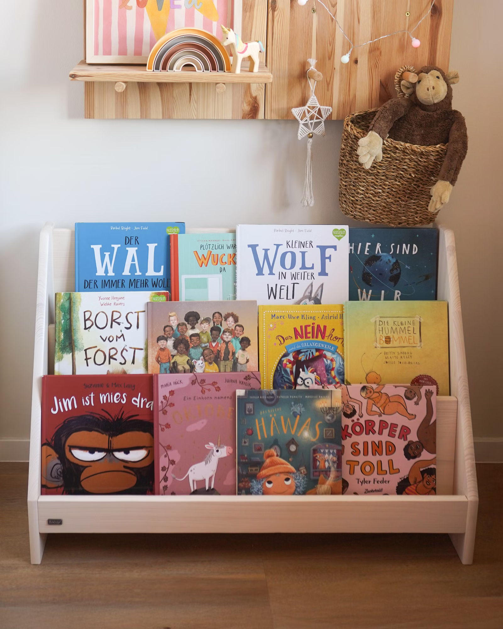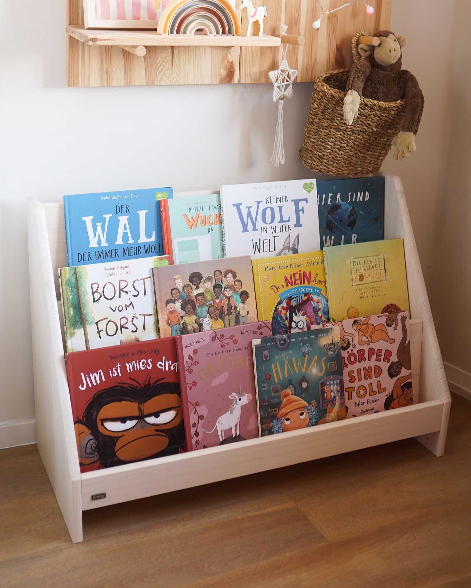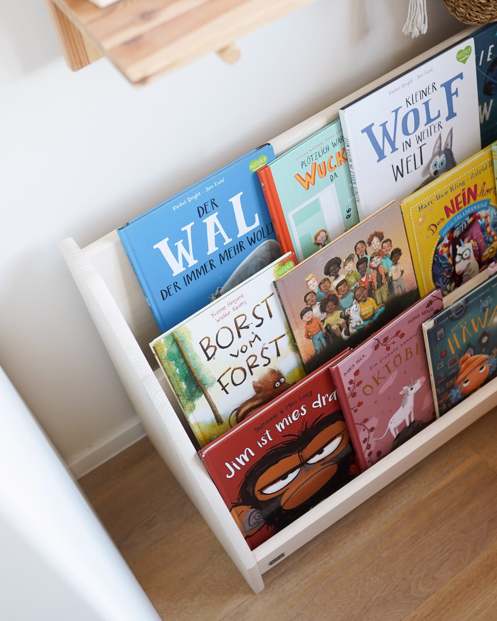 Das Robin Bücherregal kompakt ist eine wunderbare Lösung für Kindertagesstätten ebenso wie für den Einsatz zu Hause. Gefertigt aus nachhaltigem Massivholz, lässt es sich frei im Raum platzieren  – ideal zum Spielen und Stöbern. Auf der Vorderseite laden großzügige Fächer dazu ein, Bücher aller Größen mit dem Cover nach vorne zu präsentieren – perfekt, um Kinder zum Entdecken, Auswählen und gemeinsamen Lesen zu motivieren. Selbst großformatige Wimmelbücher finden hier mühelos ihren Platz.