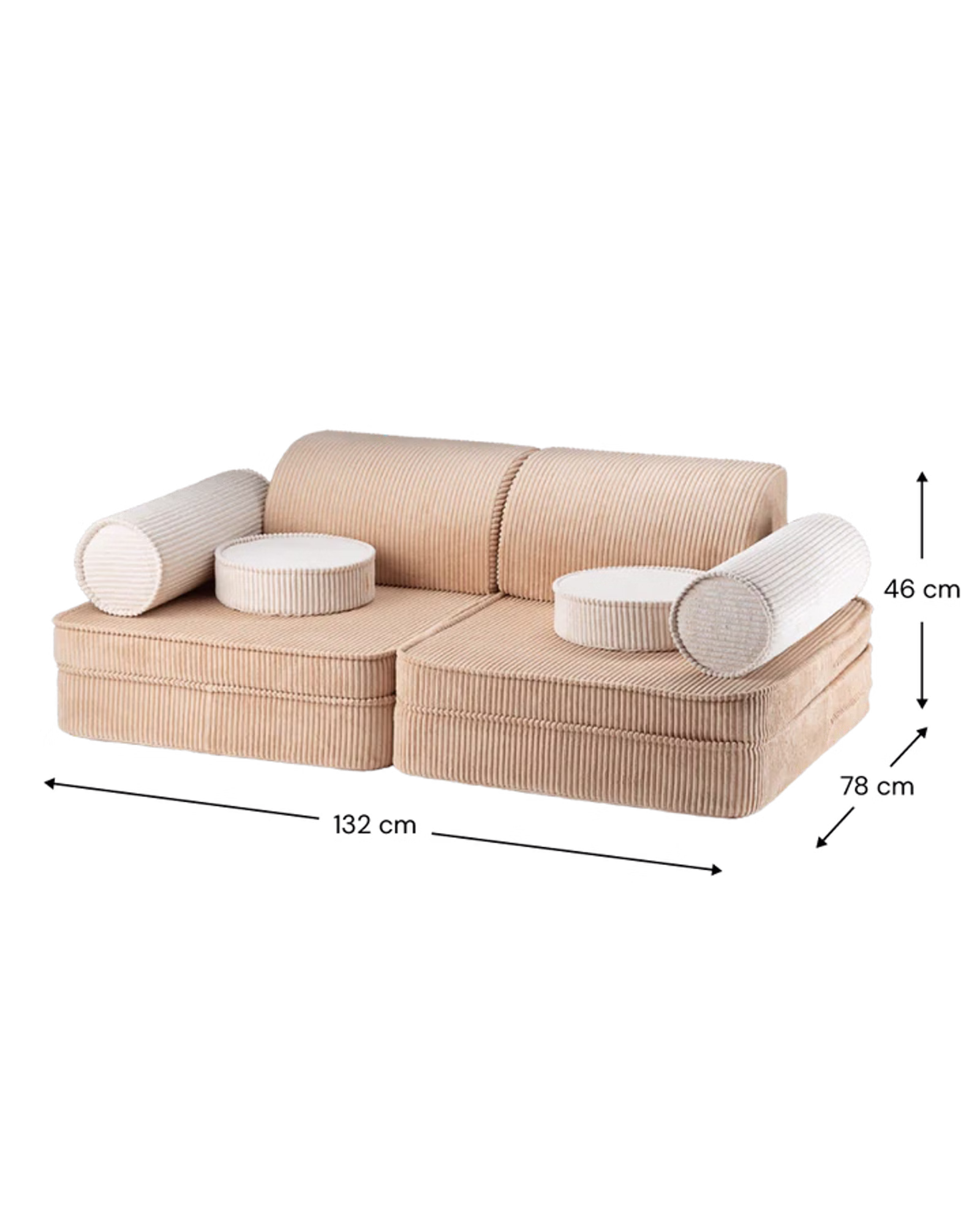 Das Sofa besteht aus 10 Teilen - zwei kleine Sitzkissen, zwei große Sitzkissen, zwei dreieckige Kissen als Rückenlehnen, zwei Rollkissen als Armlehnen und zwei runde Kissen - eine perfekte Kombination mit grenzenlosem Potenzial für fantasievolles Spiel und Entspannung. Das Spielsofa ist nicht nur ein Möbelstück - es ist eine Einladung in eine Welt voller Freude und Entdeckungen!