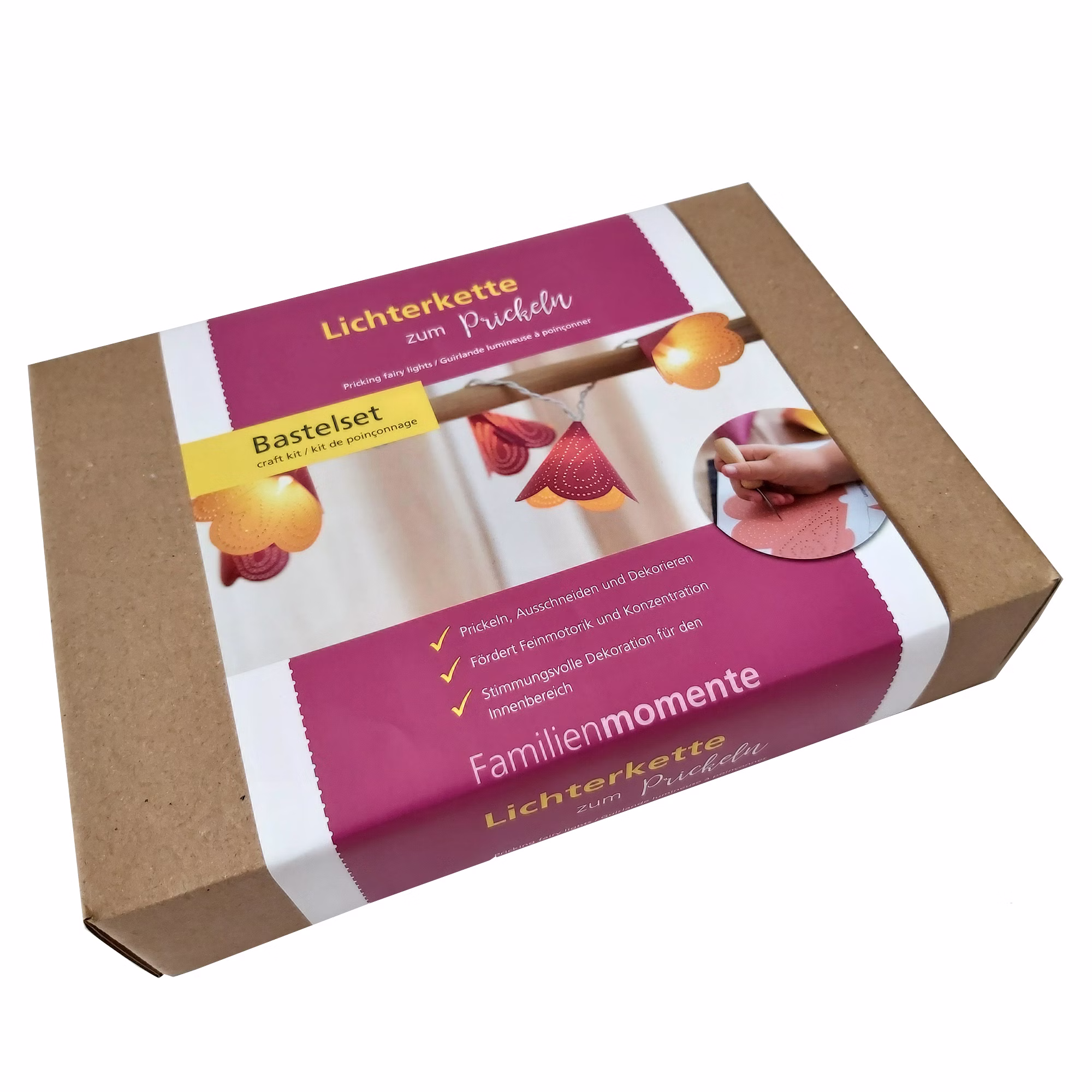Mit der Prickelnadel werden die vorgedruckten Punkte der Vorlage durchstochen, dabei schützt die Filzunterlage den Tisch. Anschließend die Lampenschirmchen ausschneiden und mithilfe der Lasche um die Lämpchen stecken – ganz ohne Kleben. Die fertige Lichterkette eignet sich ideal zur Befestigung an Spiel- und Schlafhäusern oder zur dekorativen Aufhängung an der Wand. Sobald das Licht durch die Prickelpunkte scheint, entsteht eine wunderschöne, gemütliche Atmosphäre.