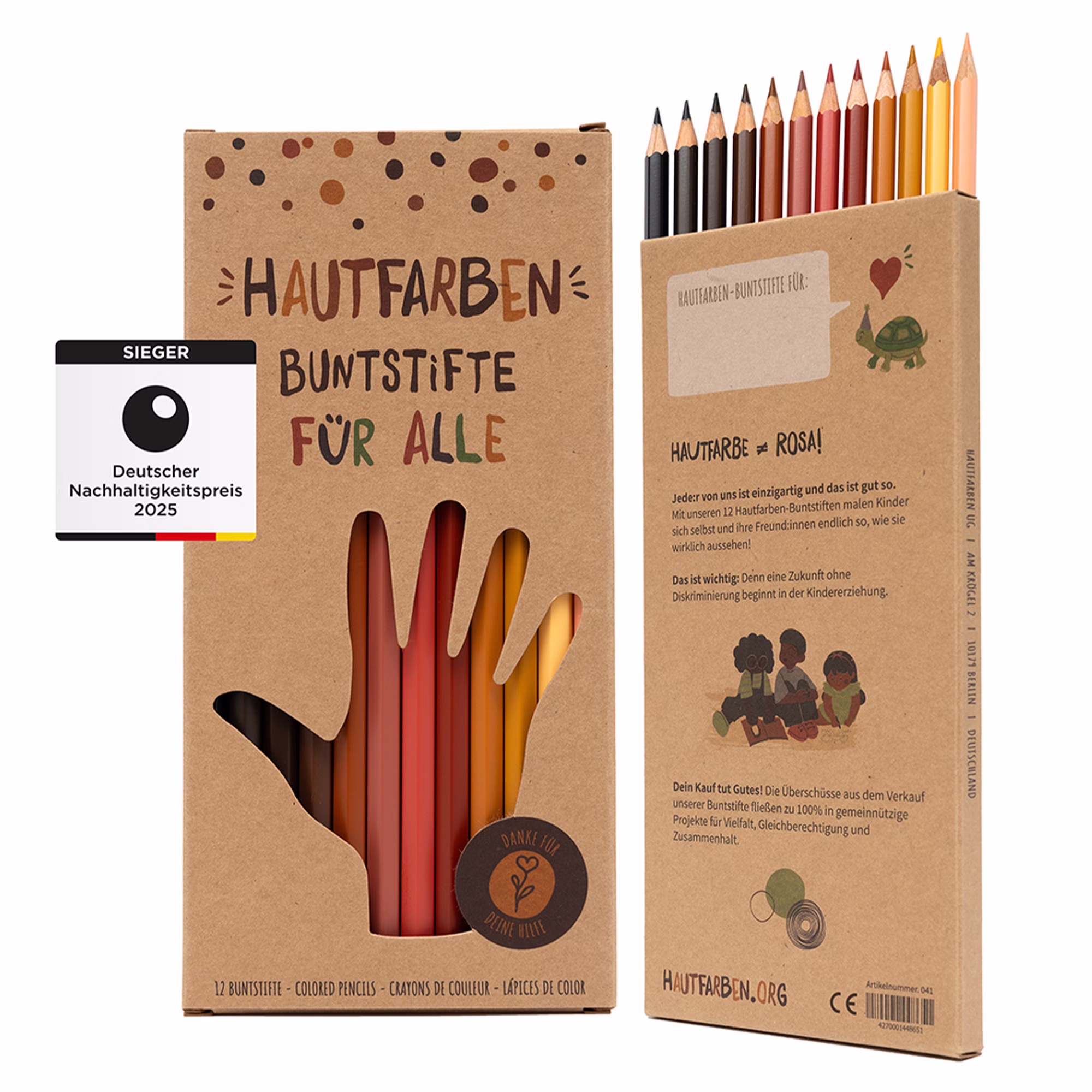 Hautfarbe ist nicht einfach rosa – und jede:r von uns ist einzigartig. Genau dieses Bewusstsein fördern die nachhaltigen Buntstifte in zwölf sorgfältig abgestimmten Hauttönen. Mit ihnen können Kinder endlich sich selbst, ihre Freund:innen und ihre Umwelt so malen, wie sie wirklich aussehen. Das stärkt nicht nur die eigene Identität, sondern auch das Verständnis für die Vielfalt in unserem Alltag.