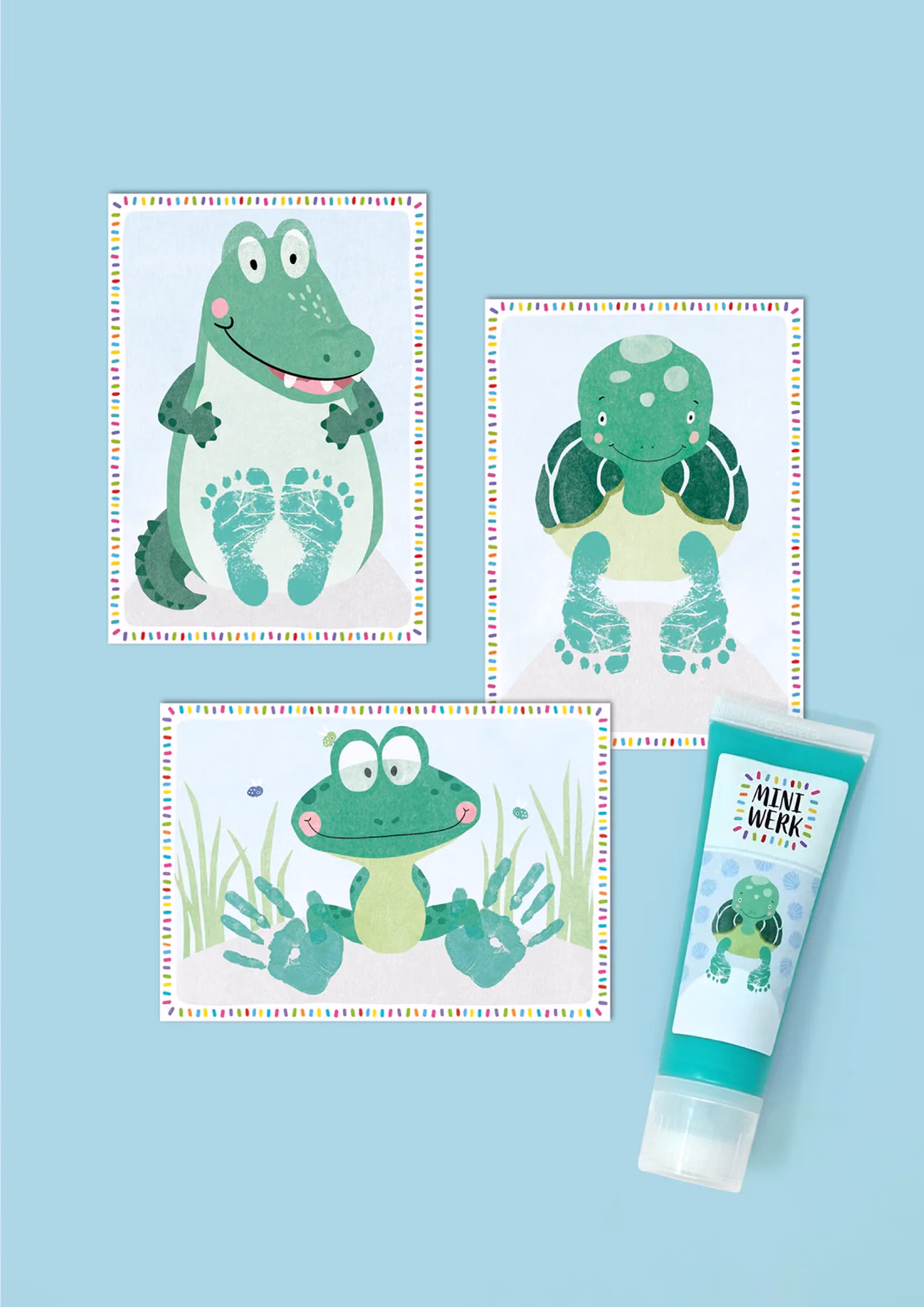 Mit den Abdrucksets sind der Fantasie keine Grenzen gesetzt: Ob zum Festhalten erster Hand- oder Fußabdrücke, zum Malen, Stempeln oder freien Gestalten – jedes Set lädt zum gemeinsamen Entdecken und Kreativsein ein. Die beiliegenden Tier-Motivkarten aus festem Naturkarton können, je nach Motiv, liebevoll mit Hand-, Finger- oder Fußabdrücken ergänzt und zu individuellen Kunstwerken ausgearbeitet werden. Sie verleihen den Abdrücken des Kindes einen ganz besonderen Rahmen und werden so zu wertvollen Erinnerungsschätzen.