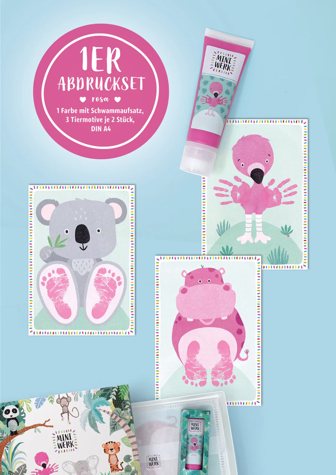 Mit den Abdrucksets sind der Fantasie keine Grenzen gesetzt: Ob zum Festhalten erster Hand- oder Fußabdrücke, zum Malen, Stempeln oder freien Gestalten – jedes Set lädt zum gemeinsamen Entdecken und Kreativsein ein. Die beiliegenden Tier-Motivkarten aus festem Naturkarton können, je nach Motiv, liebevoll mit Hand-, Finger- oder Fußabdrücken ergänzt und zu individuellen Kunstwerken ausgearbeitet werden. Sie verleihen den Abdrücken des Kindes einen ganz besonderen Rahmen und werden so zu wertvollen Erinnerungsschätzen.