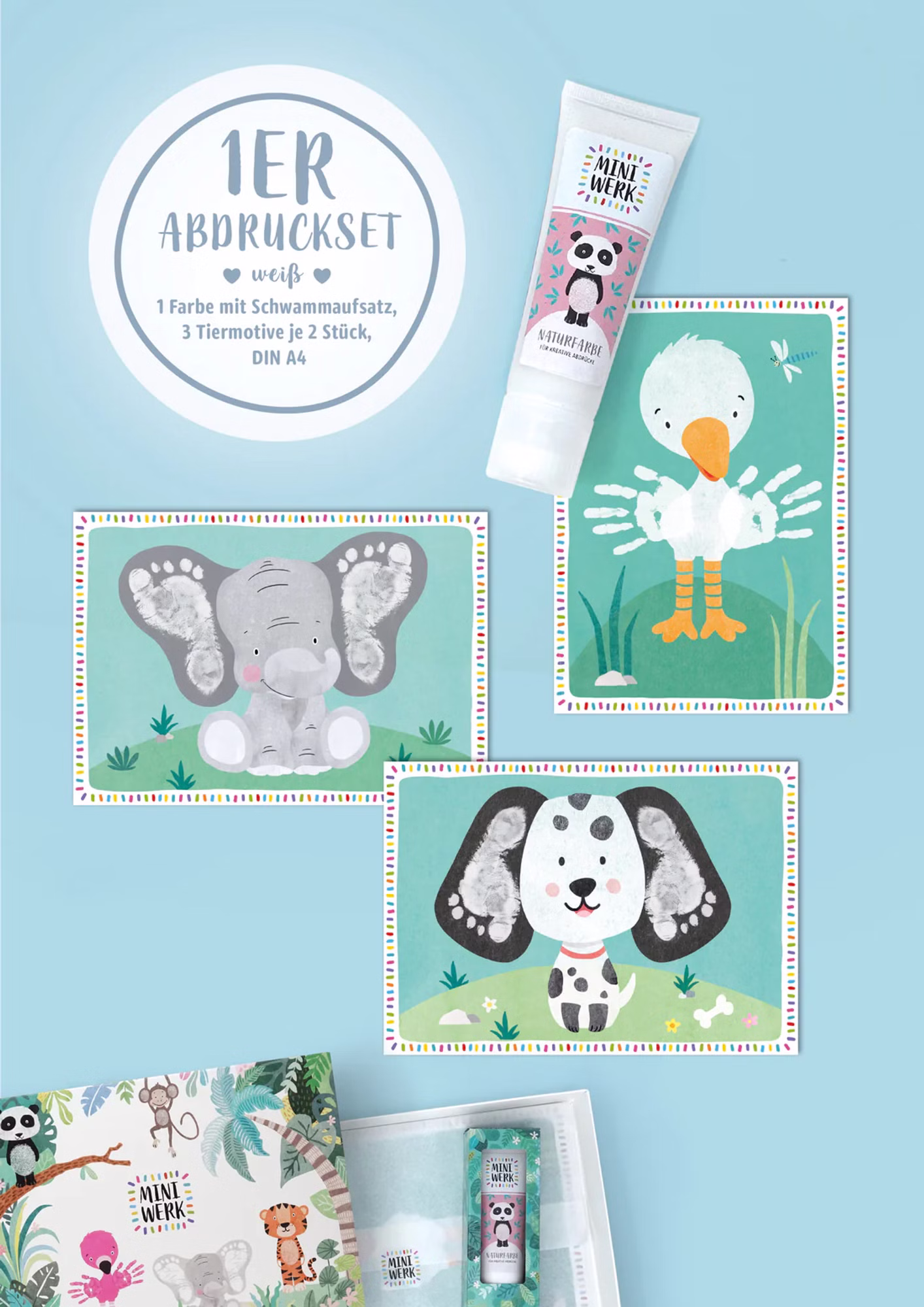 Mit den Abdrucksets sind der Fantasie keine Grenzen gesetzt: Ob zum Festhalten erster Hand- oder Fußabdrücke, zum Malen, Stempeln oder freien Gestalten – jedes Set lädt zum gemeinsamen Entdecken und Kreativsein ein. Die beiliegenden Tier-Motivkarten aus festem Naturkarton können, je nach Motiv, liebevoll mit Hand-, Finger- oder Fußabdrücken ergänzt und zu individuellen Kunstwerken ausgearbeitet werden. Sie verleihen den Abdrücken des Kindes einen ganz besonderen Rahmen und werden so zu wertvollen Erinnerungsschätzen.