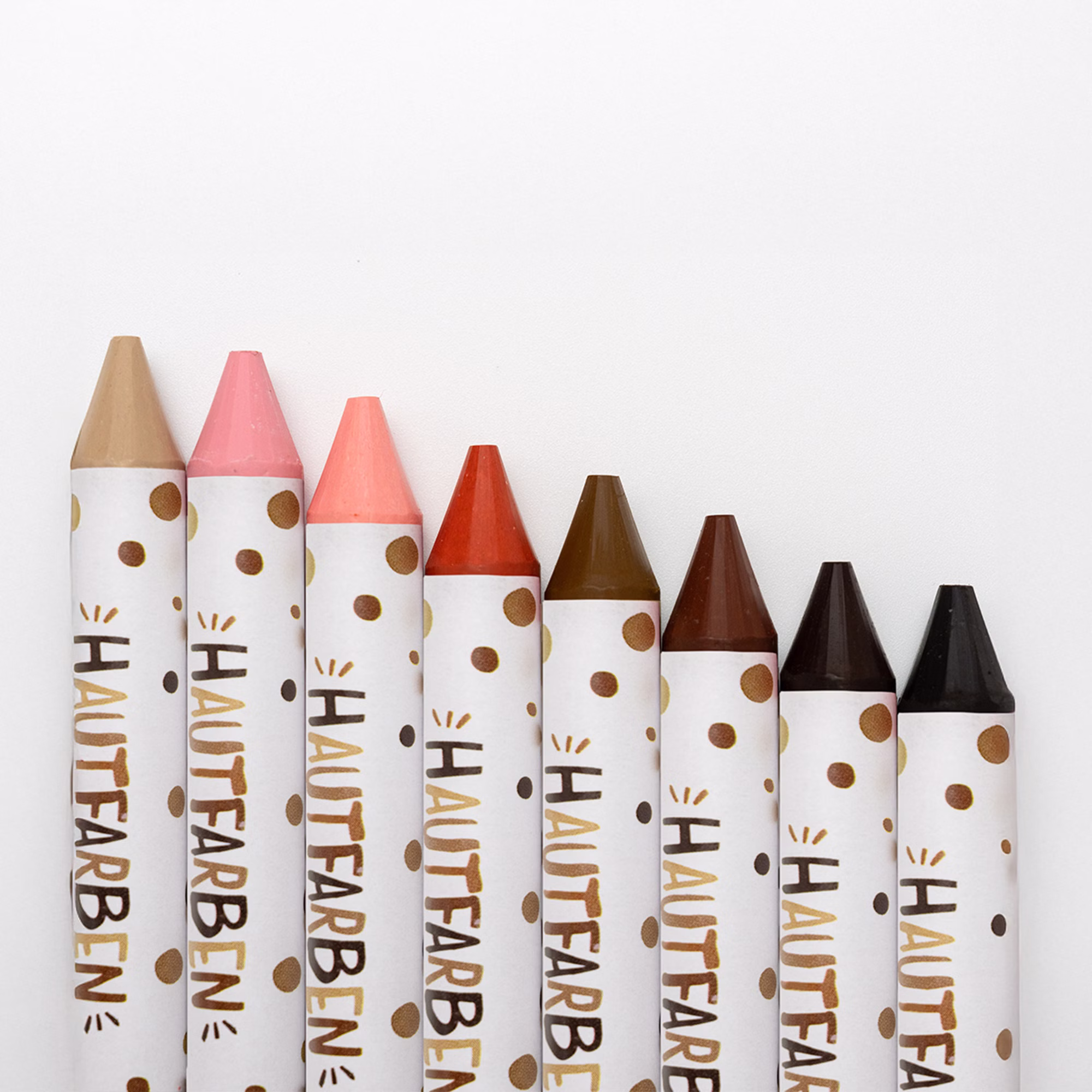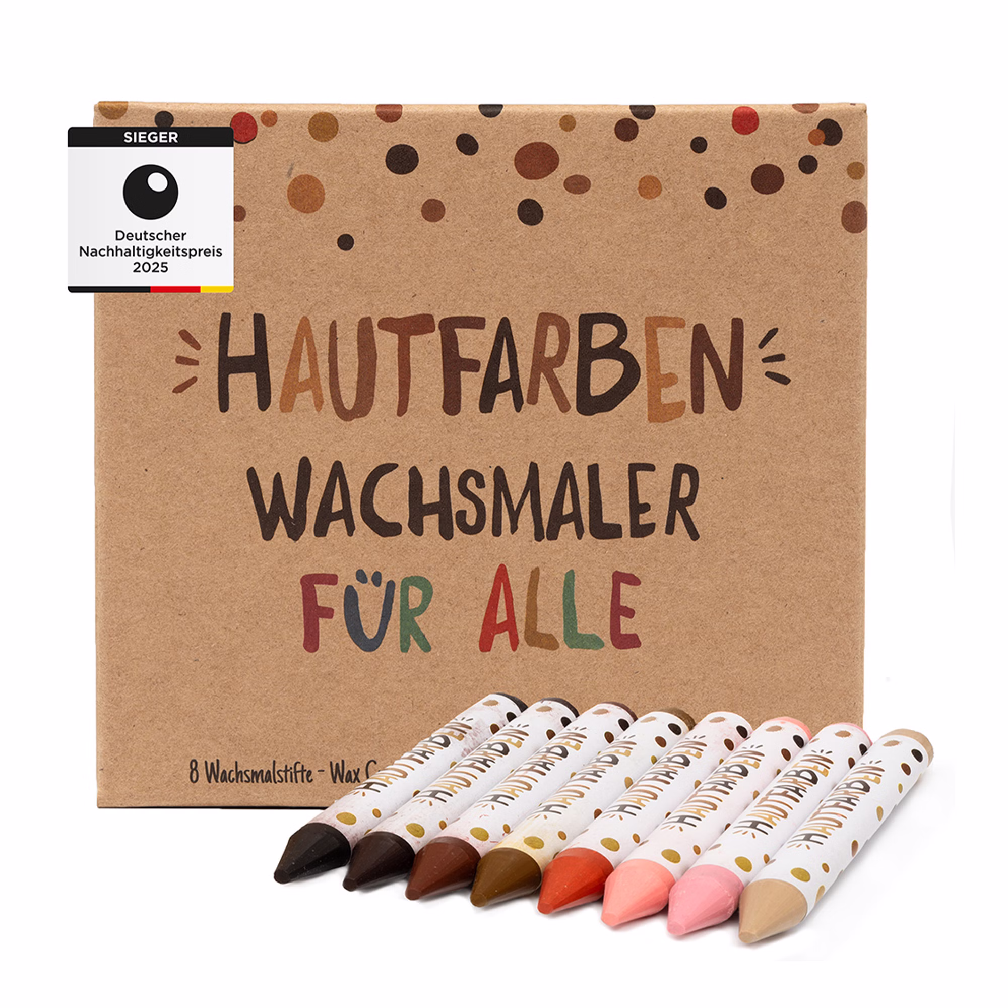 Nachhaltige Wachsmalstifte in 8 unterschiedlichen Hautfarben – von Pädagog:innen empfohlen.
