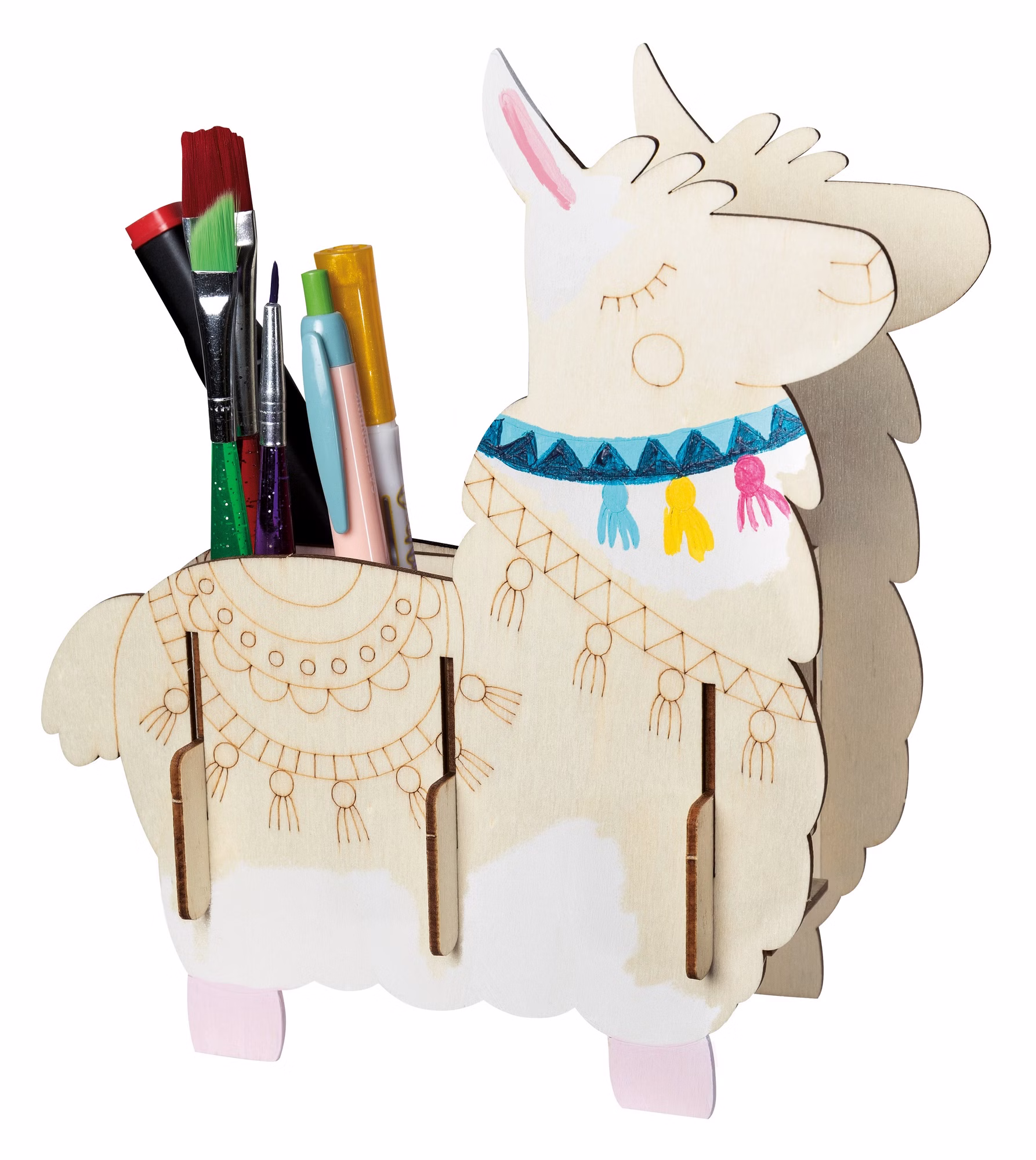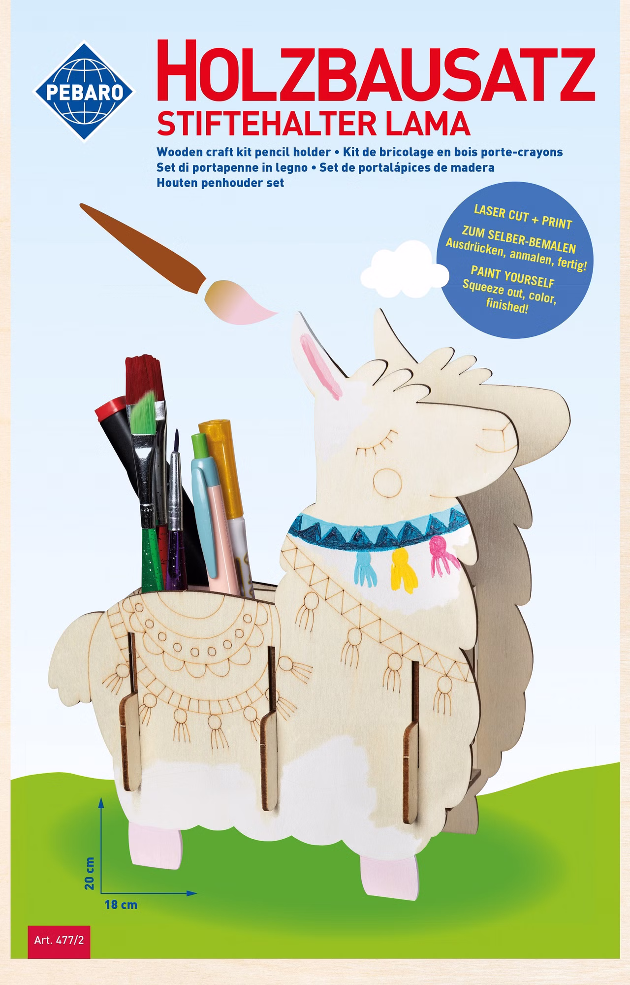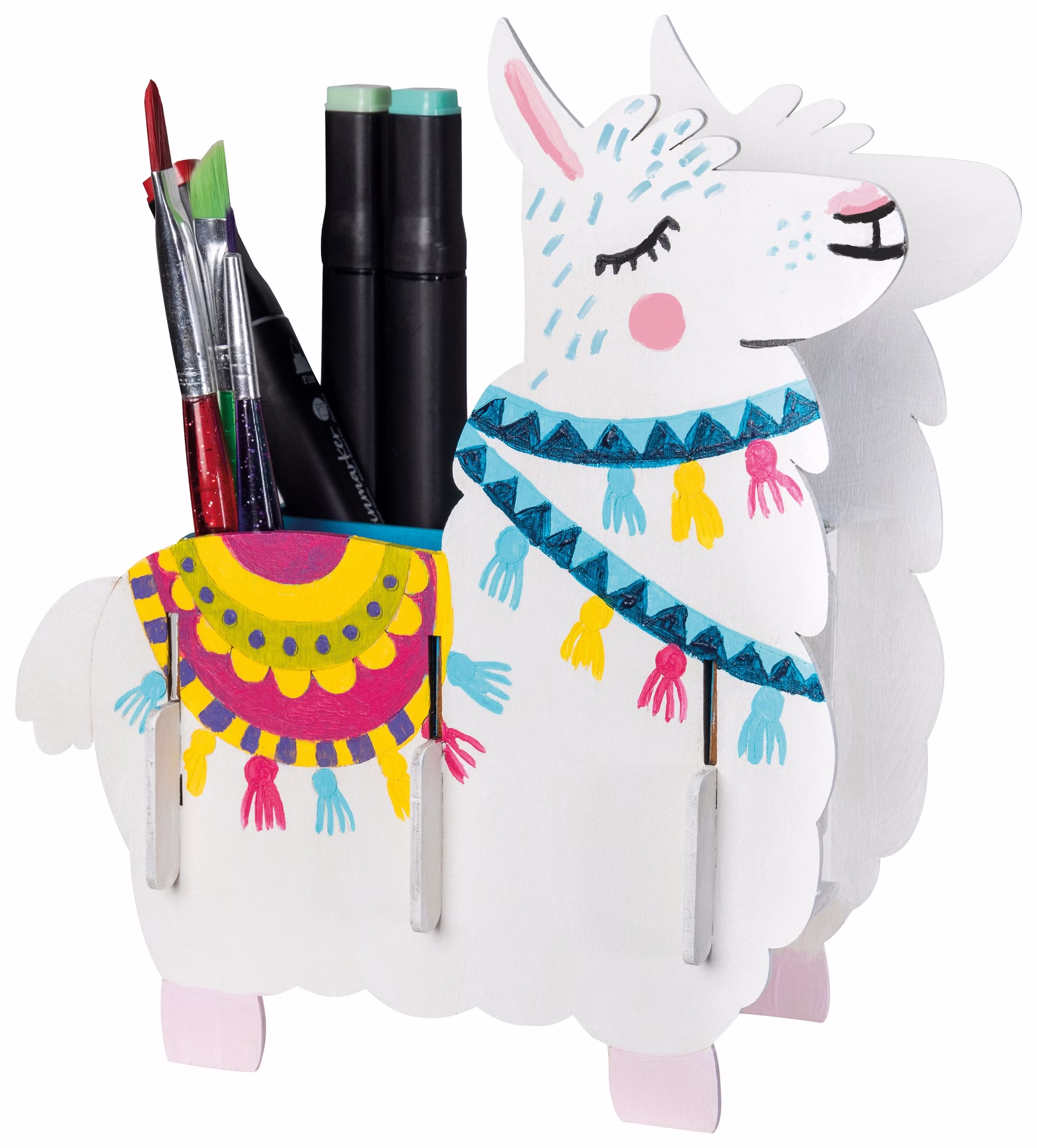 Mit dem Holzbauset Stiftebox Lama entsteht eine originelle und praktische Stiftebox, die ganz nach eigenen Vorstellungen gestaltet werden kann. Der kreative Modellbausatz aus Holz wird einfach zusammengesteckt und anschließend bemalt – ausdrücken, anmalen, fertig! Ideal für Bastelbegeisterte, Kinder und kreative Köpfe jeden Alters.