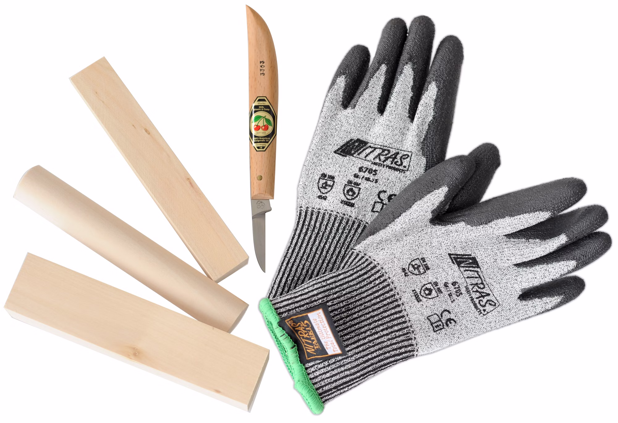 Das hochwertige Schnitz-Set enthält alles, was Sie für kreatives Holzhandwerk benötigen: ein Paar schnitthemmende Handschuhe (Größe 5) für maximale Sicherheit, drei hochwertige Schnitzhölzer für präzise Schnitte und ein scharfes Kirschenschnitzmesser, mit dem Sie selbst feine Details mühelos meistern.
