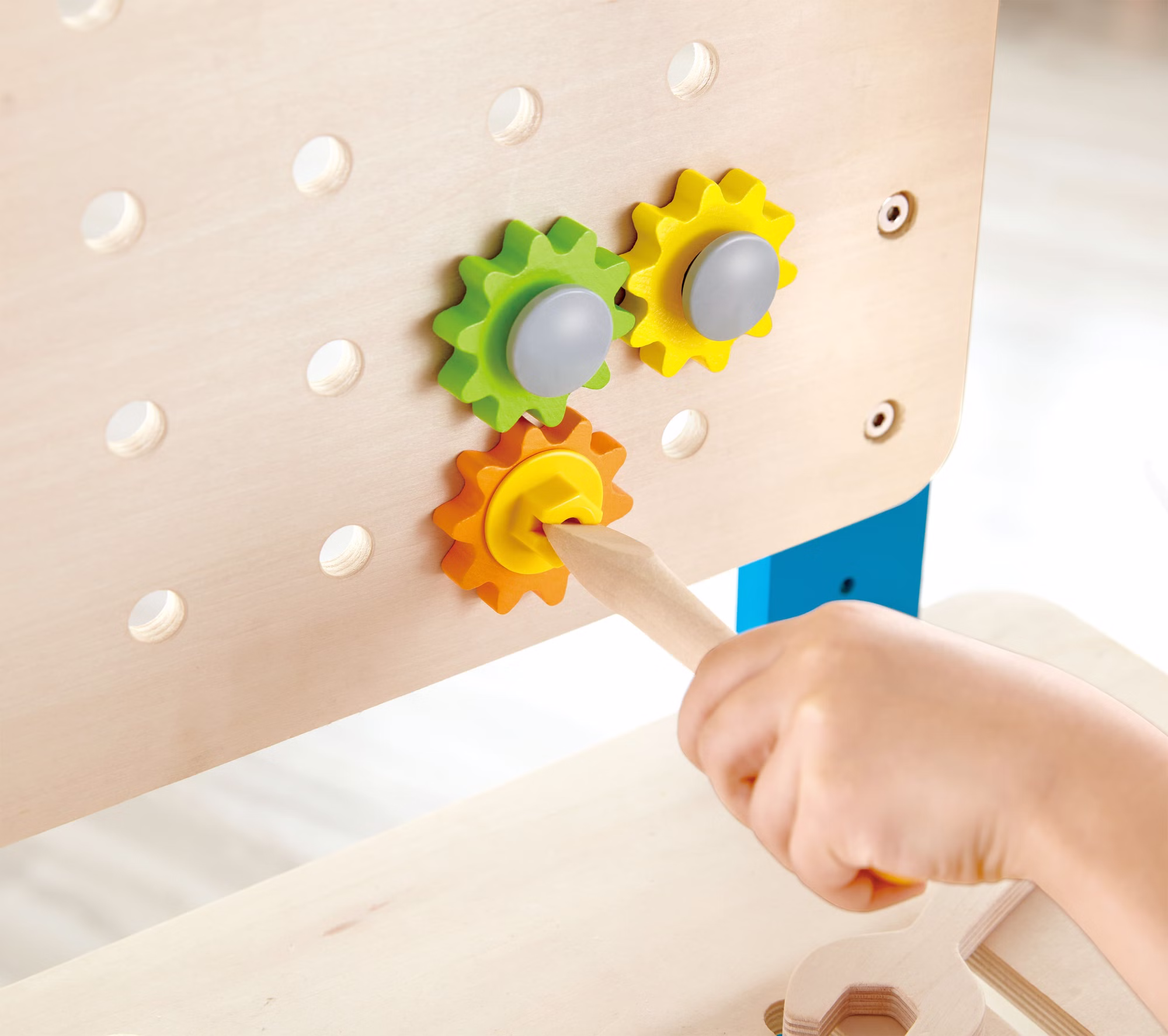 Mit Hammer, Schraubenzieher und weiterem Zubehör lassen sich spannende Bauprojekte verwirklichen. Ob Schrauben festziehen, Teile zusammensetzen oder neue Konstruktionen ausprobieren – hier wird gebaut, geschraubt und entdeckt. Das Spielen mit der Werkbank fördert dabei nicht nur die Fantasie, sondern auch die Feinmotorik, Konzentration und das technische Verständnis.