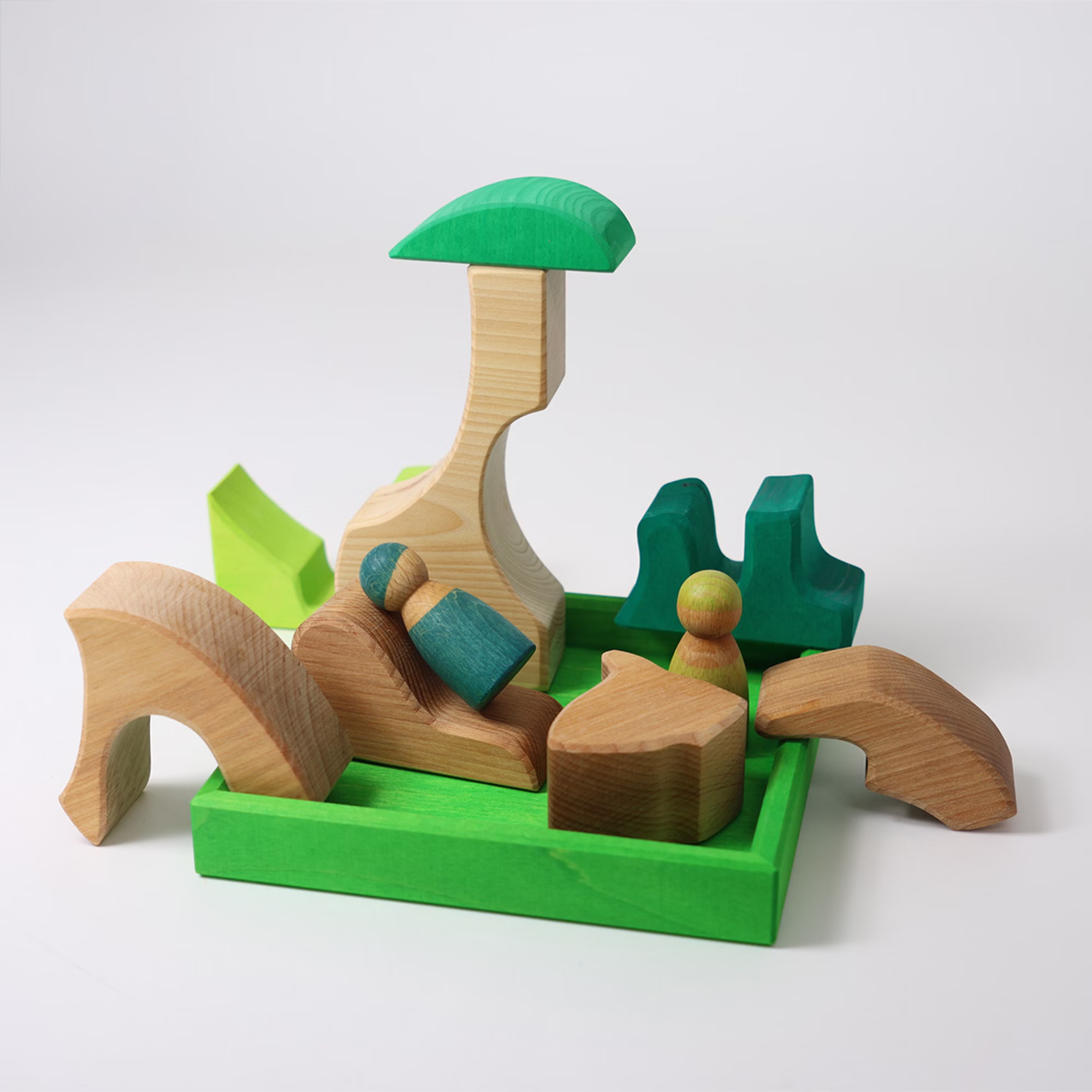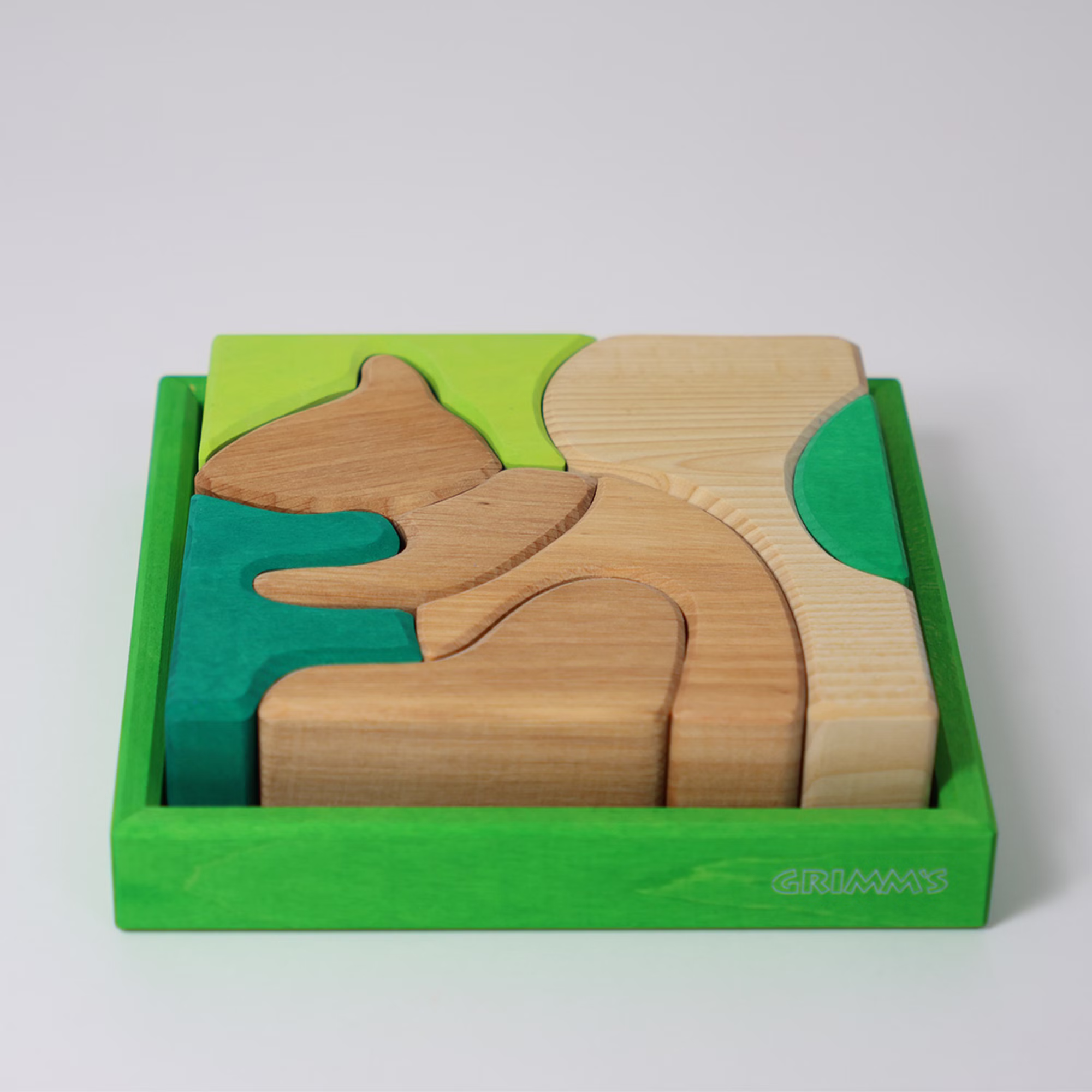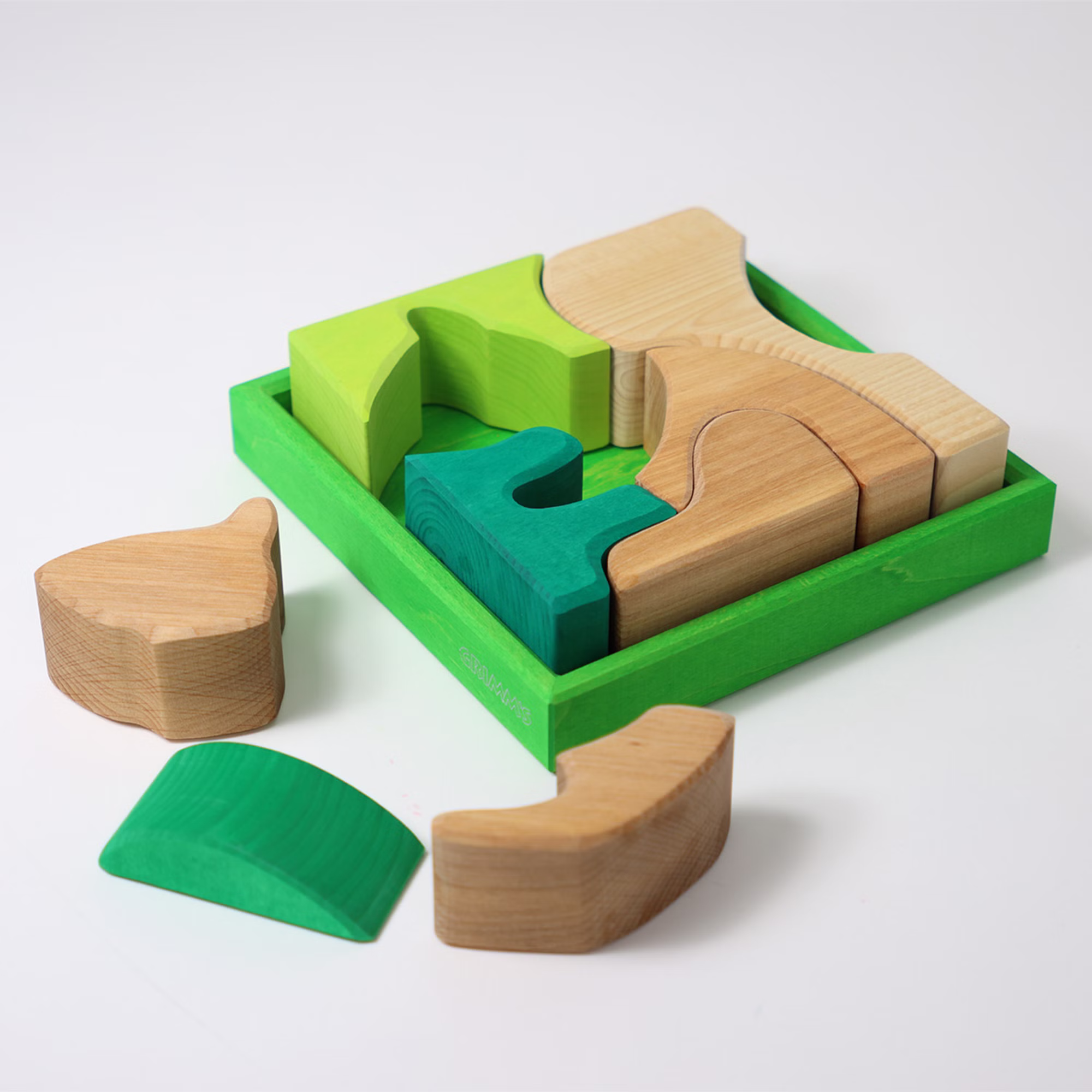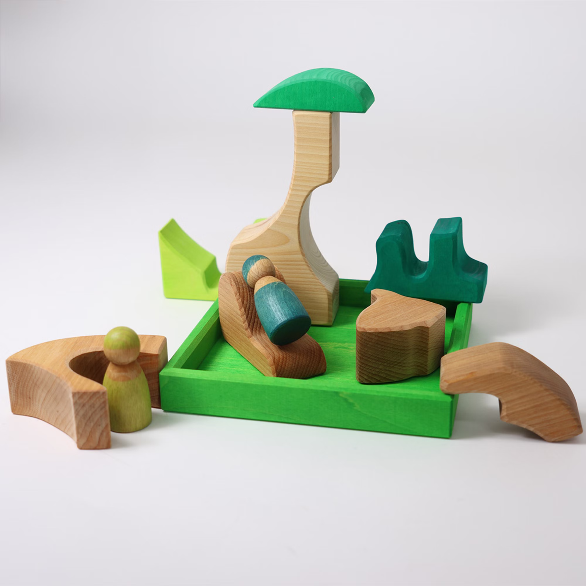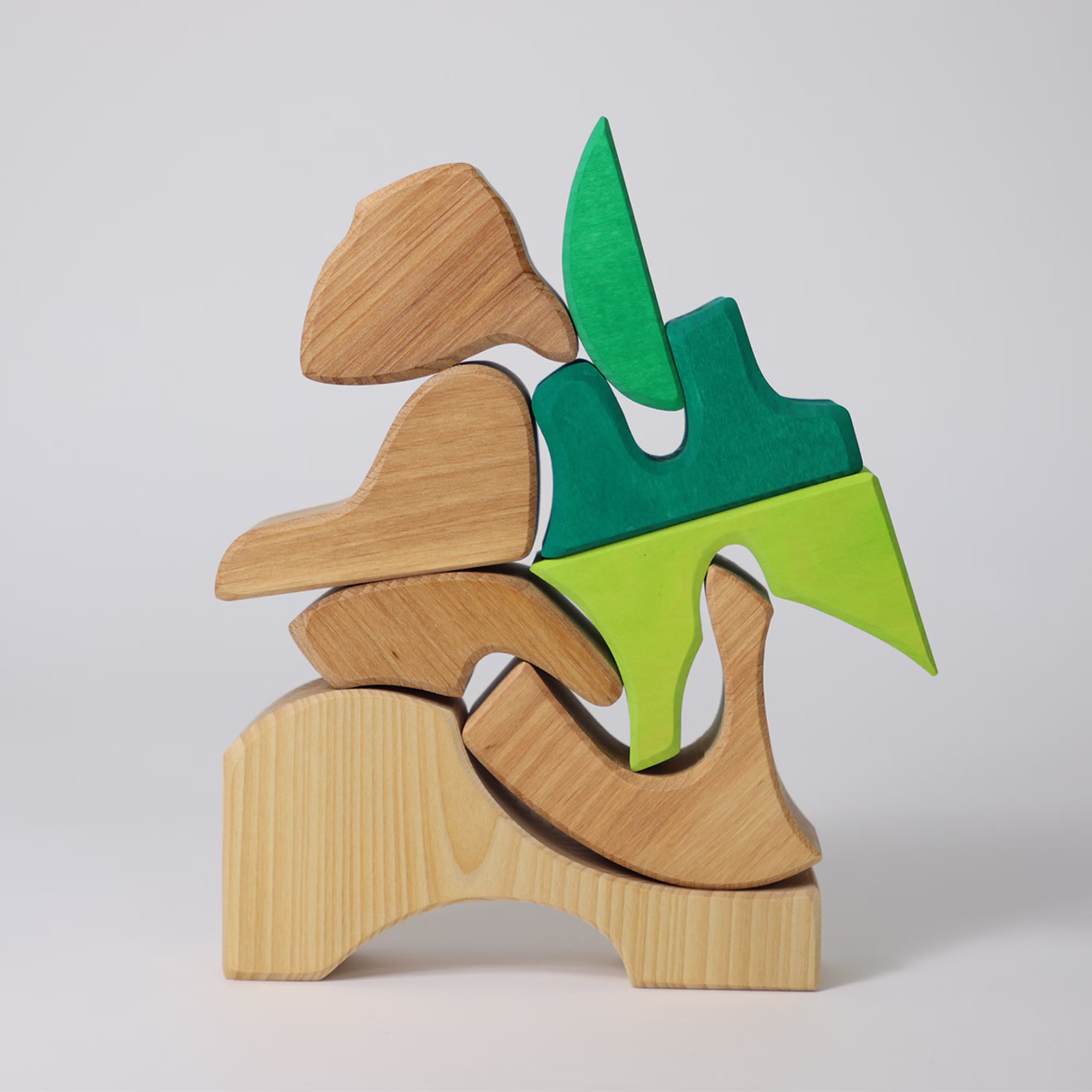 Umhüllt vom satten Grün der Blätter fühlt sich das Eichhörnchen sicher und geborgen. Außerhalb des Rahmens werden die unterschiedlichen Bausteine zu dschungelartigen Dino-Landschaften. Bauspiel ist Teil der Grimms vier Farb-Bauspiele. Mit ihren großen Teilen sind sie gemacht für die kleinsten Hände. Die Farbvarianten ermöglichen ein erstes Heranführen an die Primär- und Sekundärfarben und deren unterschiedliche Wirkung.