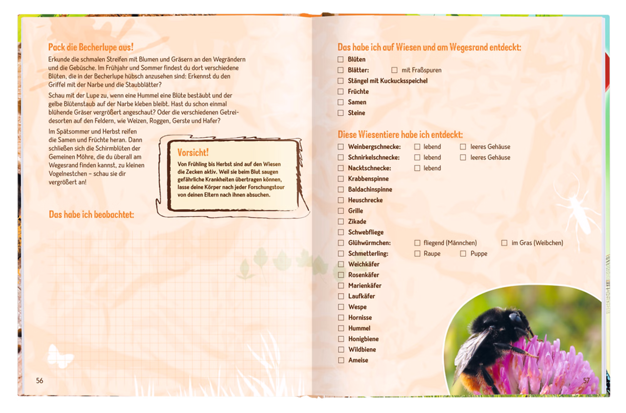 Am Ende des Buches wartet eine praktische Sammeltasche aus Papier, in der kleine Forscherinnen Blüten, Blätter oder Steinchen sammeln können. Ob allein, mit Freundinnen oder mit der Familie – das Buch beantwortet faszinierende Fragen wie: „Wie wird eine Kaulquappe zum Frosch?“ oder „Warum haben rote Waldameisen manchmal Flügel?“ und macht Naturerlebnisse erlebbar.