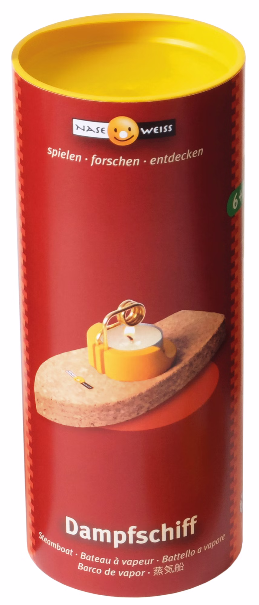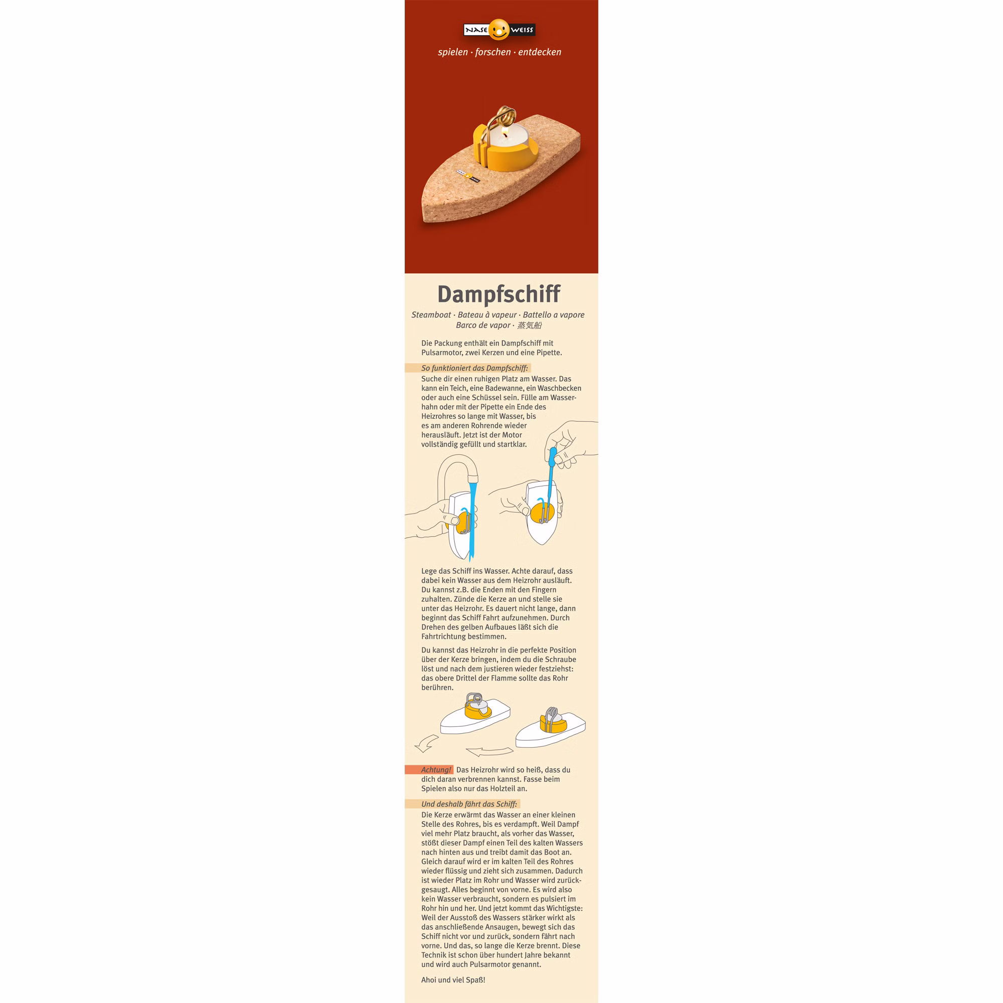 Unter die wassergefüllte Spirale des Dampfschiffes wird ein Teelicht gestellt - und schon geht es los. Und das, so lange die Kerze brennt. Pulsarmotor nennt sich diese raffinierte Technik. Durch Drehen des gelben Aufbaus lässt sich die Fahrtrichtung bestimmten. So haben alle Spaß beim ungefährlichen Einsatz in der Badewanne oder in anderen ruhigen Gewässern.