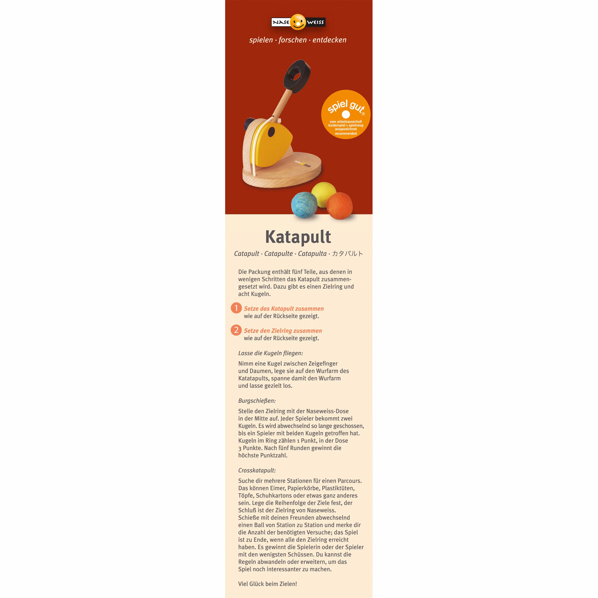 Mit dem Katapult lassen sich leichte Kugeln über abenteuerliche Kurse bis in Ziel schießen. Dabei sind Geschicklichkeit und Geduld gefragt. Und ein ganz neuer Blick auf die Welt - wo ist das nächste spannende Ziel? Werde Sieger bei deiner eigenen Katapult-Meisterschaft!