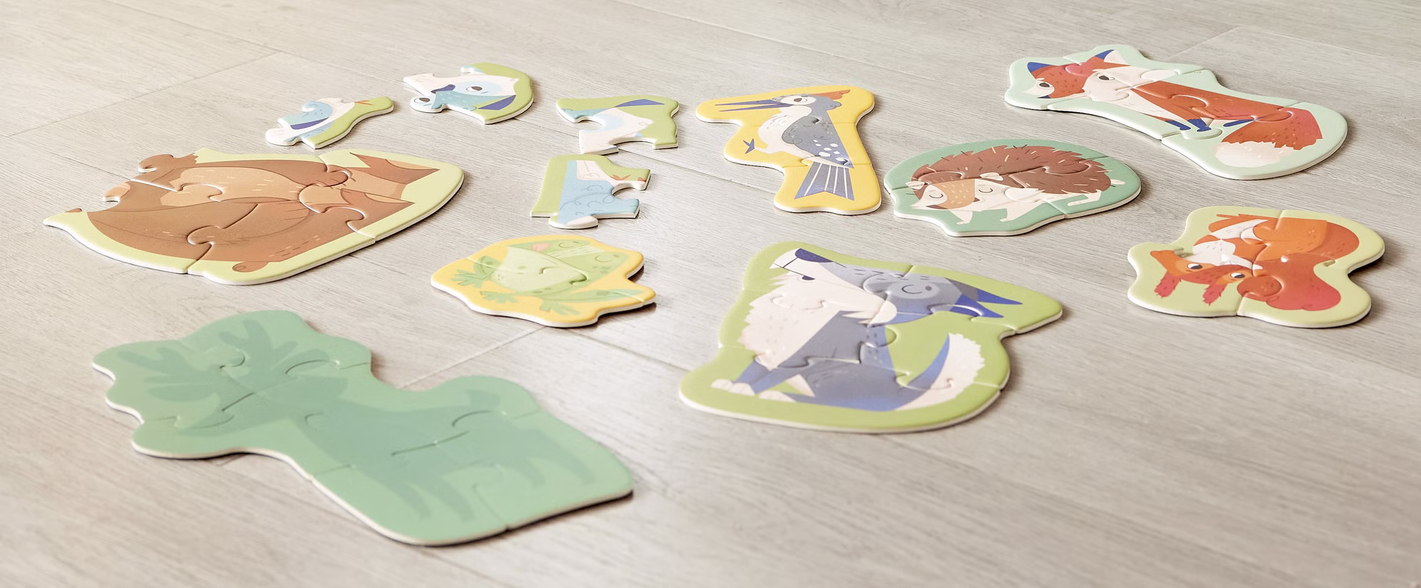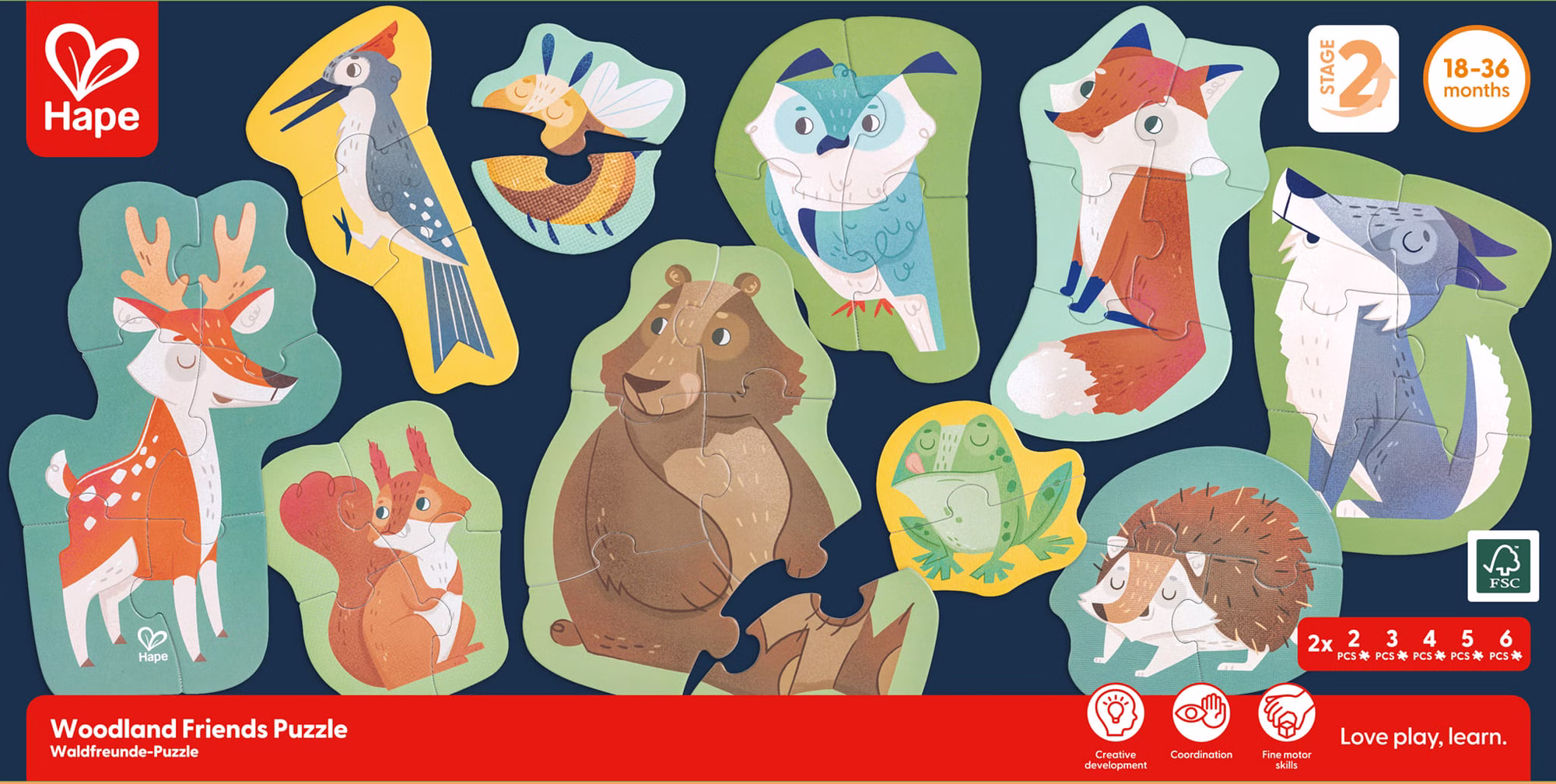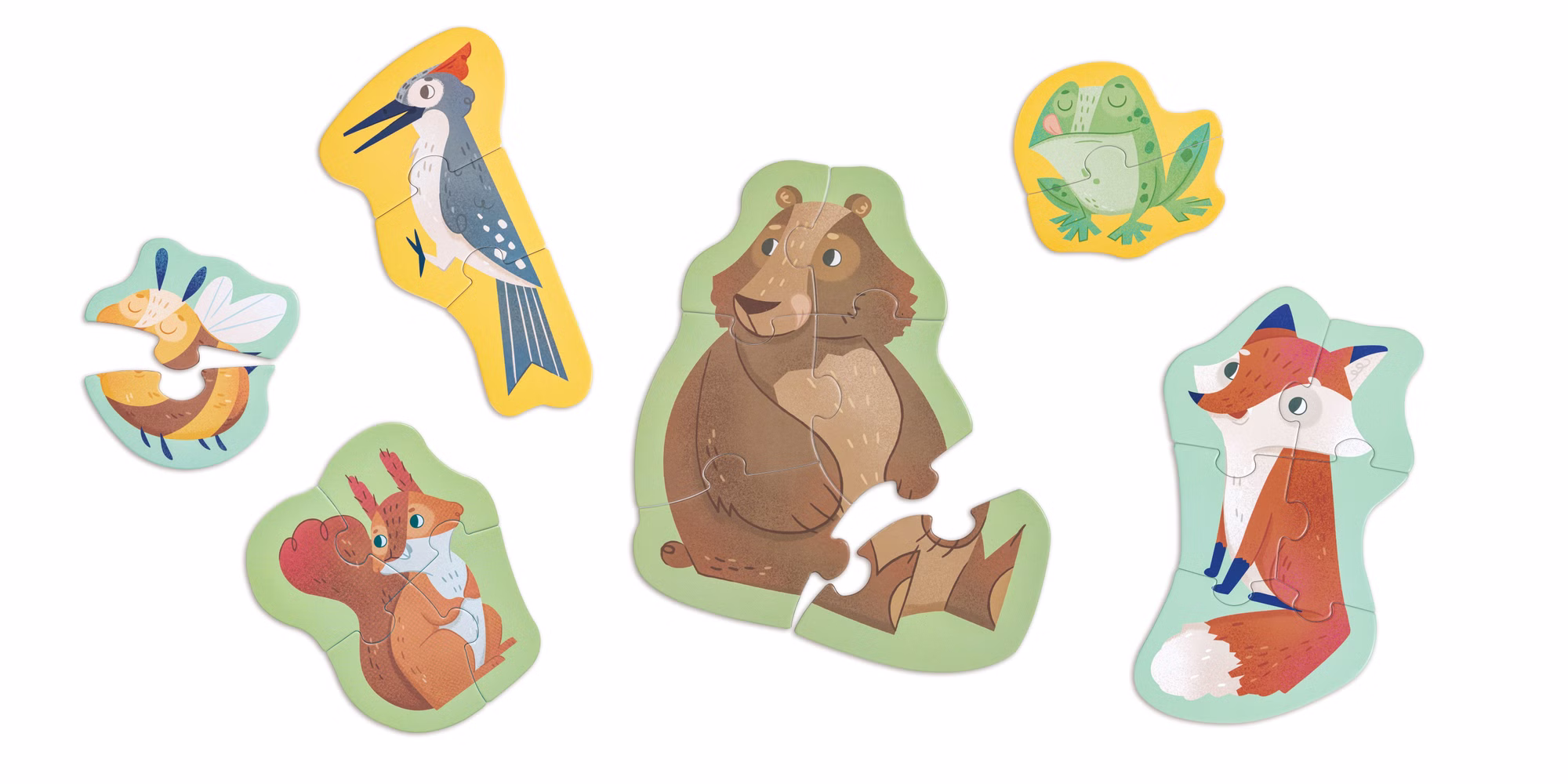 Das Set enthält zehn liebevoll gestaltete Puzzles mit max. 2-6 Teile pro Puzzle. Waldtieren wie Biene, Hirsch, Fuchs, Specht, Frosch, Bär, Eule, Eichhörnchen, Wolf und Igel. Beim Zusammensetzen lernen Kinder, Probleme zu lösen und erleben die positiven Ergebnisse ihrer Arbeit. Das stärkt ihr Selbstvertrauen und bereitet sie auf künftige, größere Herausforderungen vor.