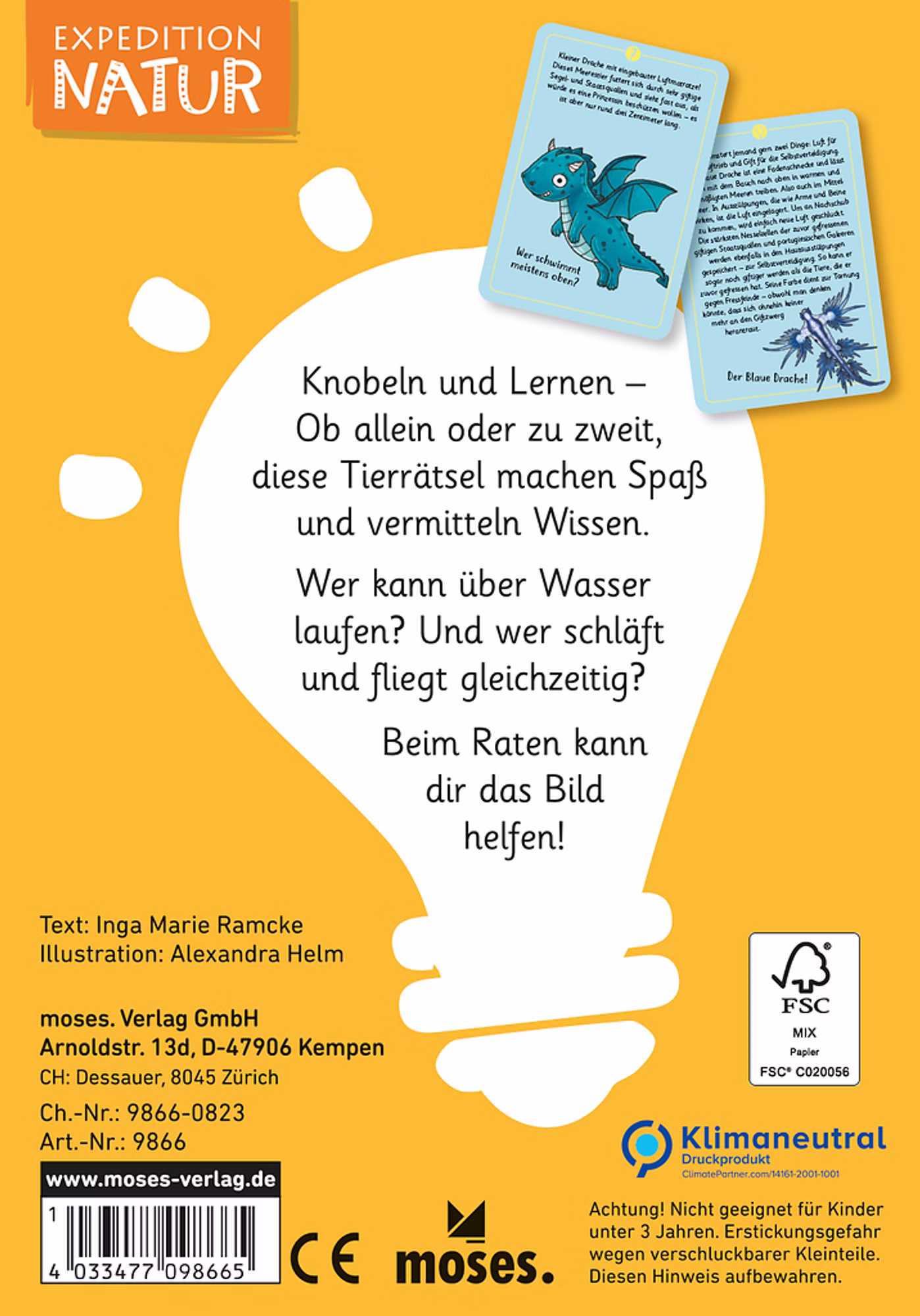 Die Expedition Natur Tierrätsel – Tricks & Tarnung vermitteln Wissen auf besonders spielerische Weise. Humorvolle Rätseltexte laden Kinder dazu ein, ihr Wissen über erstaunliche Fähigkeiten im Tierreich zu testen und zu erweitern. Nach einer geheimnisvollen Beschreibung hilft die Illustration mit kleinen Hinweisen – die Lösung und spannende Zusatzinfos finden sich auf der Rückseite der Karte.