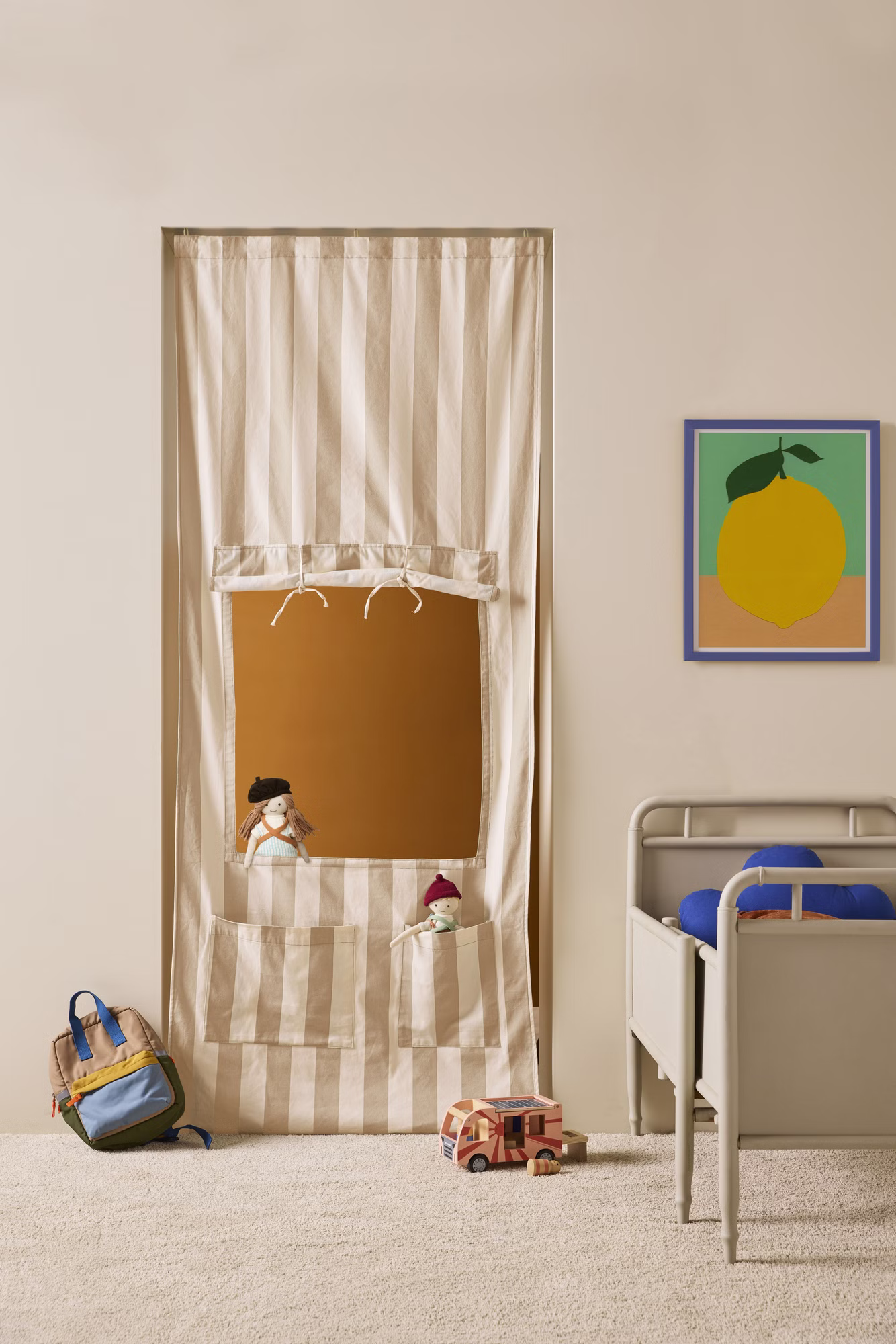 Ein an der Tür befestigter Textilvorhang ist eine einfache und spielerische Ergänzung für die perfekte Theaterbühne oder den Verkaufstresen.