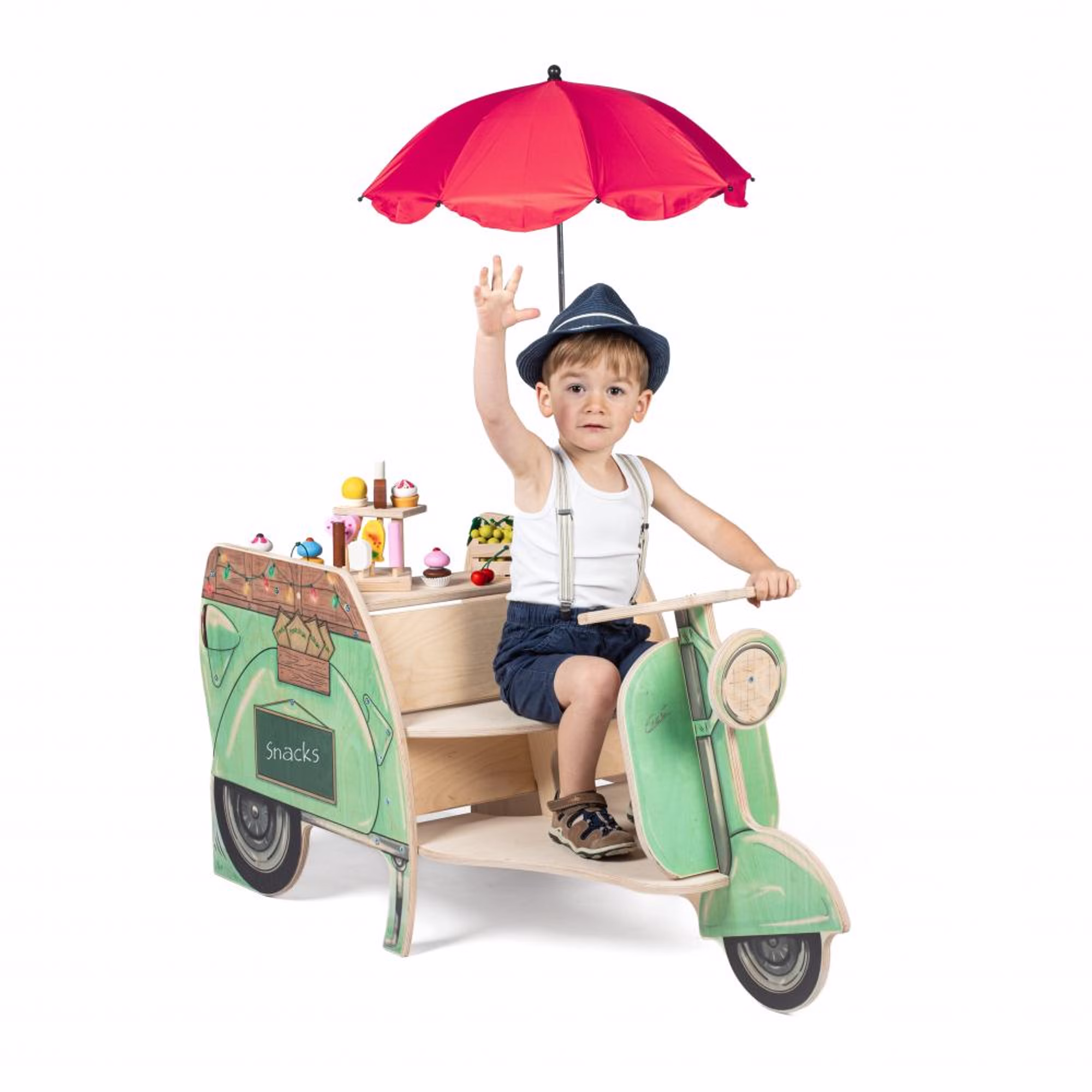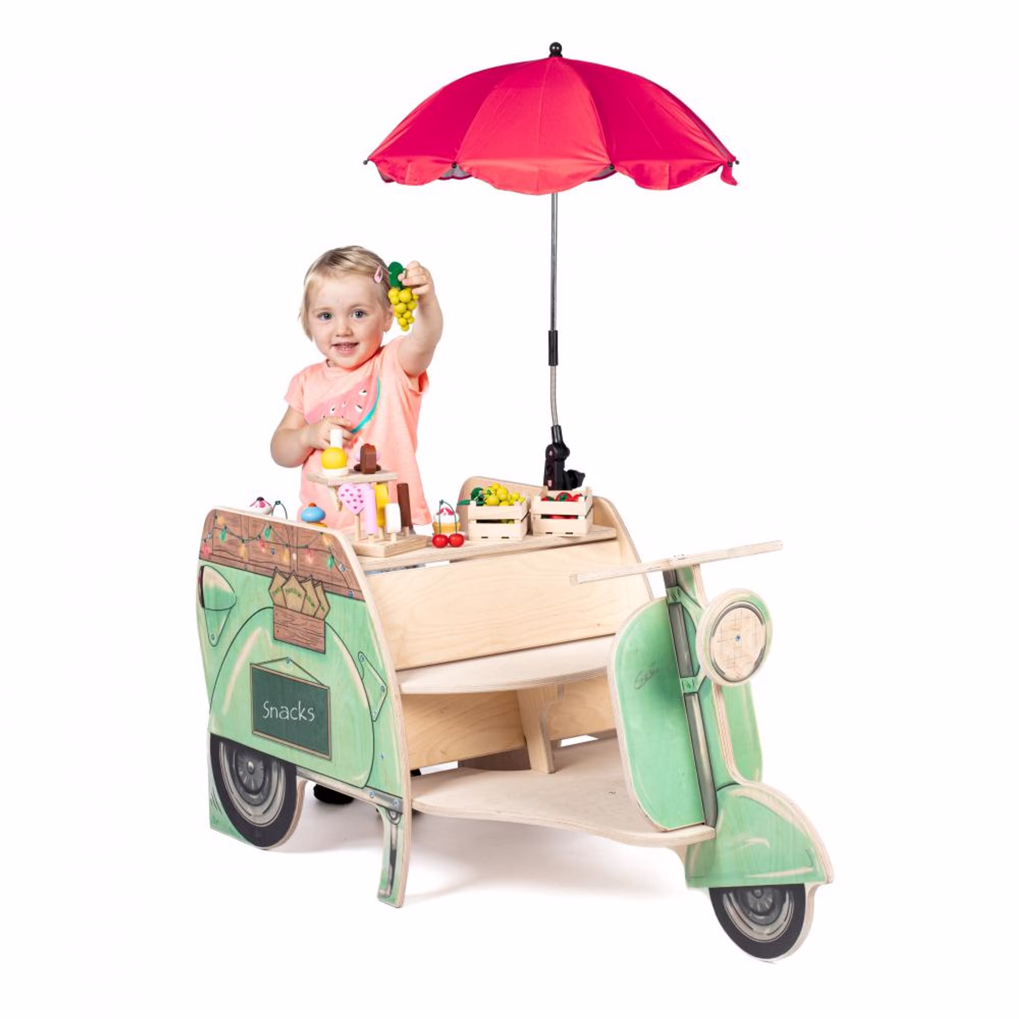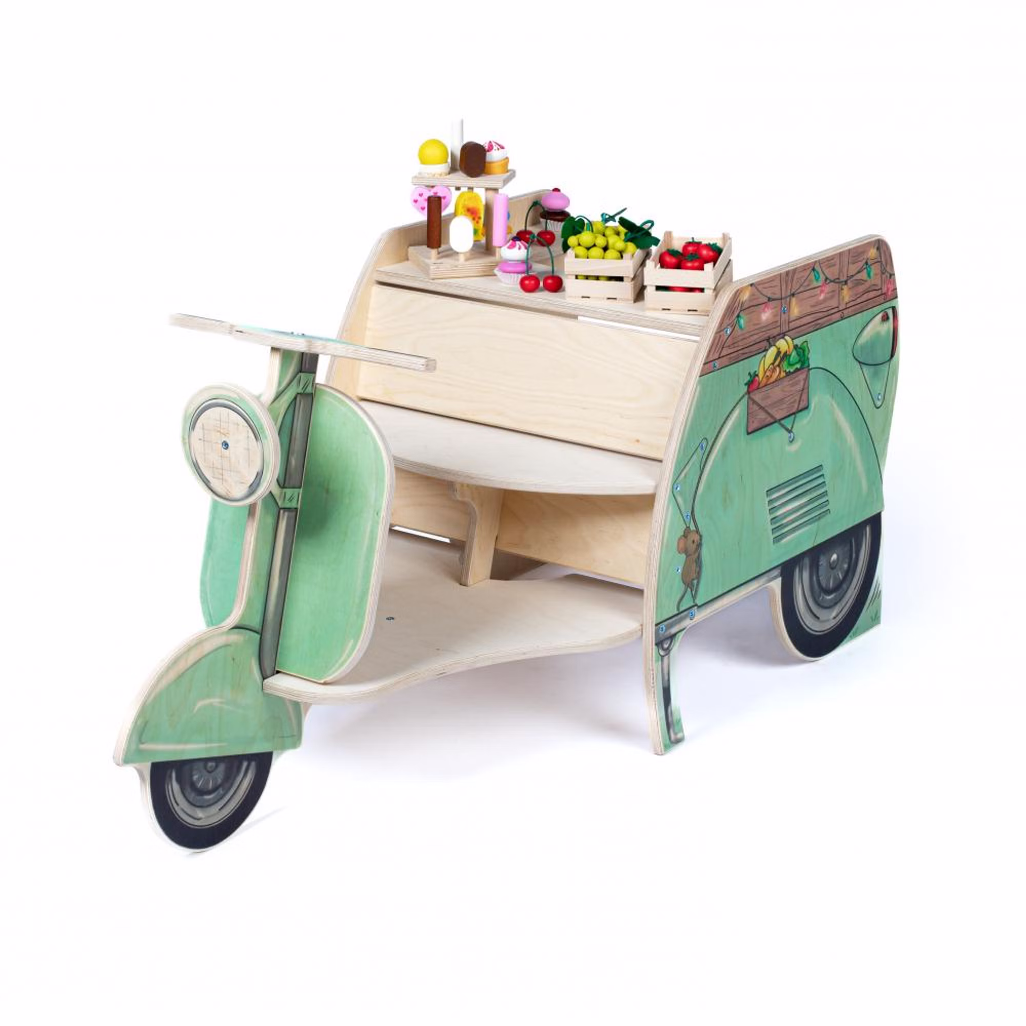 Der Streetfood Roller begeistert Kinder mit seinem charmanten Retro-Design und liebevoll gestalteten Details. Vorne können sie sitzen, lenken und auf Entdeckungstour gehen, während sich der hintere Bereich in einen vielseitigen Verkaufsstand verwandelt. Ob Eis, Bratwurst oder Obst – der Roller lädt zu kreativen Rollenspielen ein und bietet im großzügigen Verkaufsbereich viel Platz für eigene Ideen.