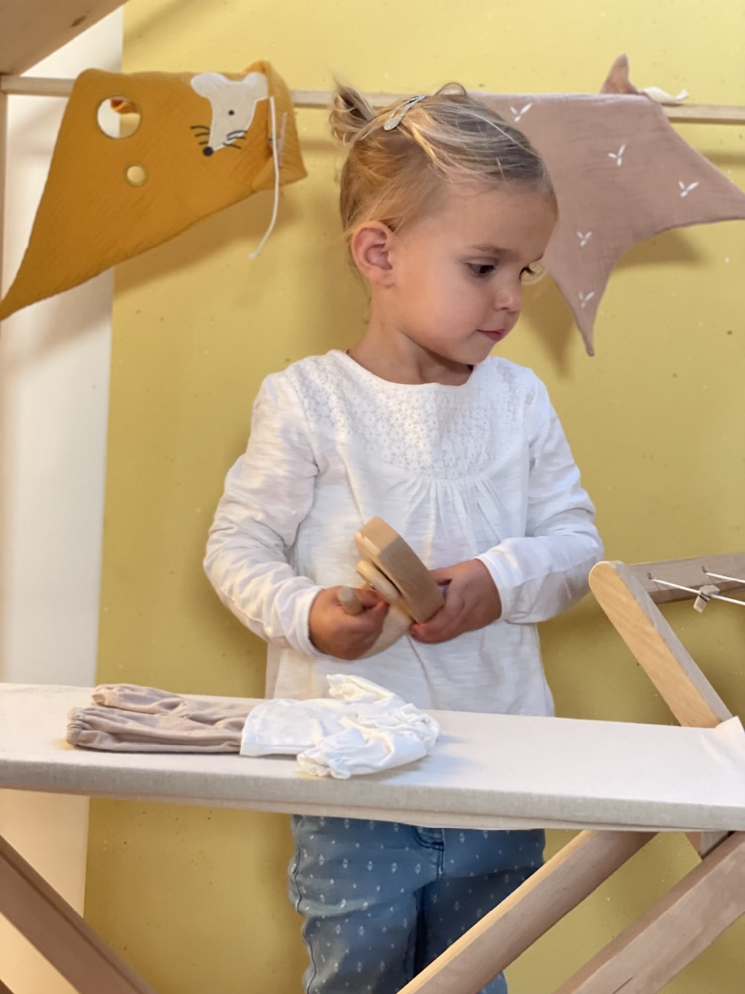 Perfekt für jeden Kinderhaushalt. Ein schönes und stabiles Bügelbrett aus Holz inkl. Bügeleisen. Das Bügelbrett hat eine kindgerechte Arbeitshöhe und ist in 2 Höhen verstellbar. Die kindliche Entwicklung wird durch die spielerische Erledigung alltäglicher Aufgaben gefördert.
