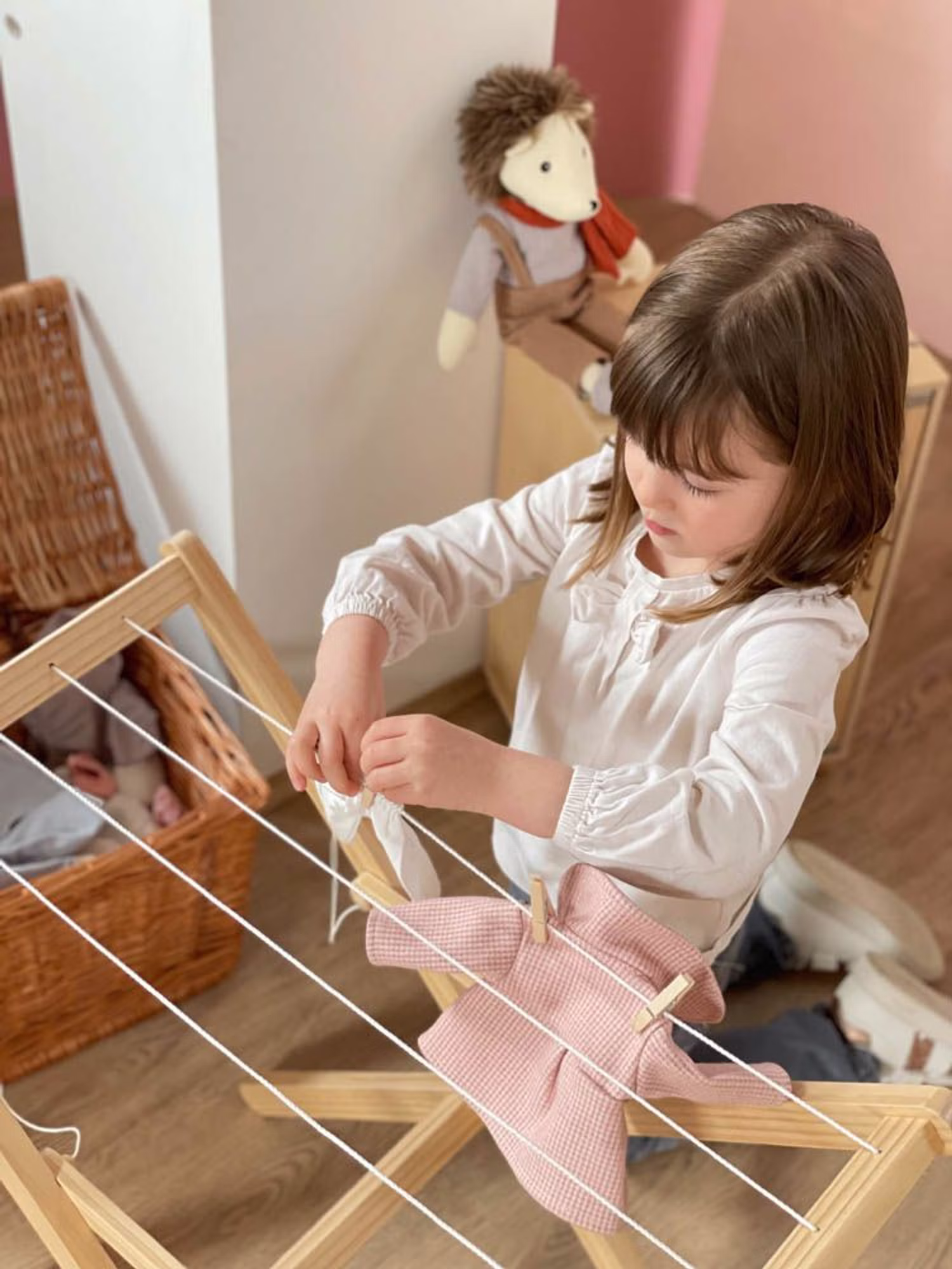 Perfekt für jeden Kinderhaushalt. Ein schöner und stabiler Wäscheständer aus Massivholz zum Aufhängen aller Puppenkleider. Durch die kindgerechte Arbeitshöhe ist der Wäscheständer ein ideales Rollenspielzeug, um Eltern im Haushalt nachzuahmen und Kinder spielerisch für alltägliche Aufgaben zu begeistern.