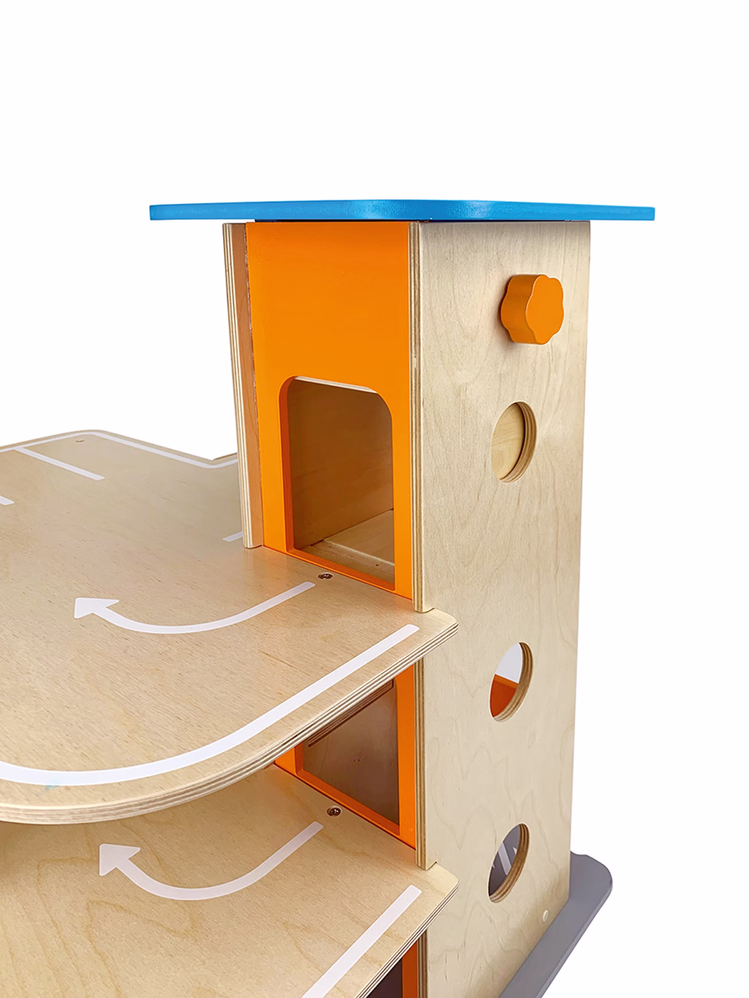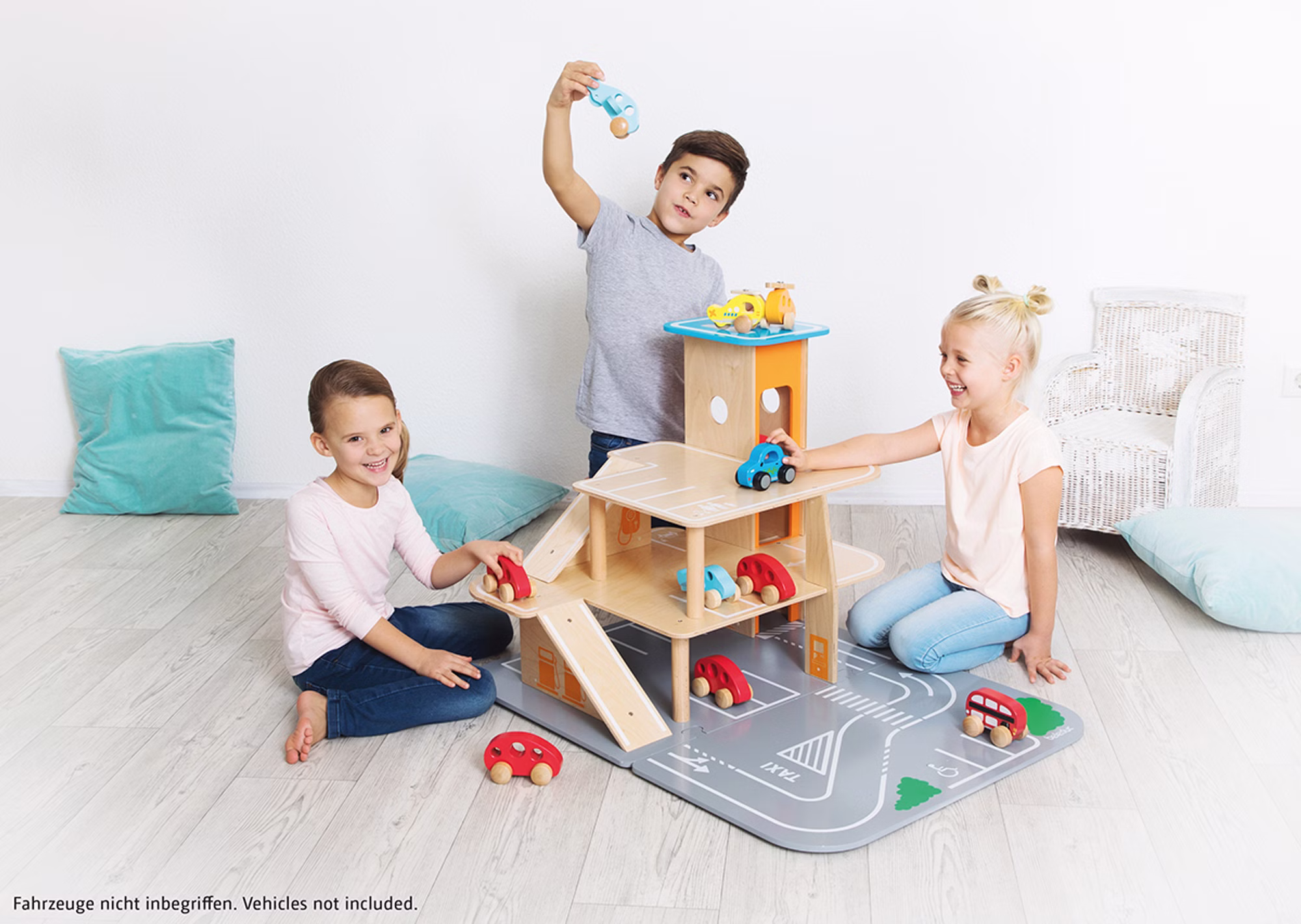 Egal ob parken, tanken, waschen, reparieren – das große Parkhaus steckt voller Ideen und ist von allen Seiten bespielbar. Auf drei Ebenen können Autos in der Garage geparkt werden oder die Rampen in einem Rutsch hinunterflitzen oder es geht direkt von der Anfahrtsstraße auf einen der eingezeichneten Parklätze. Der Fahrstuhl, der über einen Seilzug bedient wird, befördert die Fahrzeuge auf die verschiedenen Parkhausebenen.