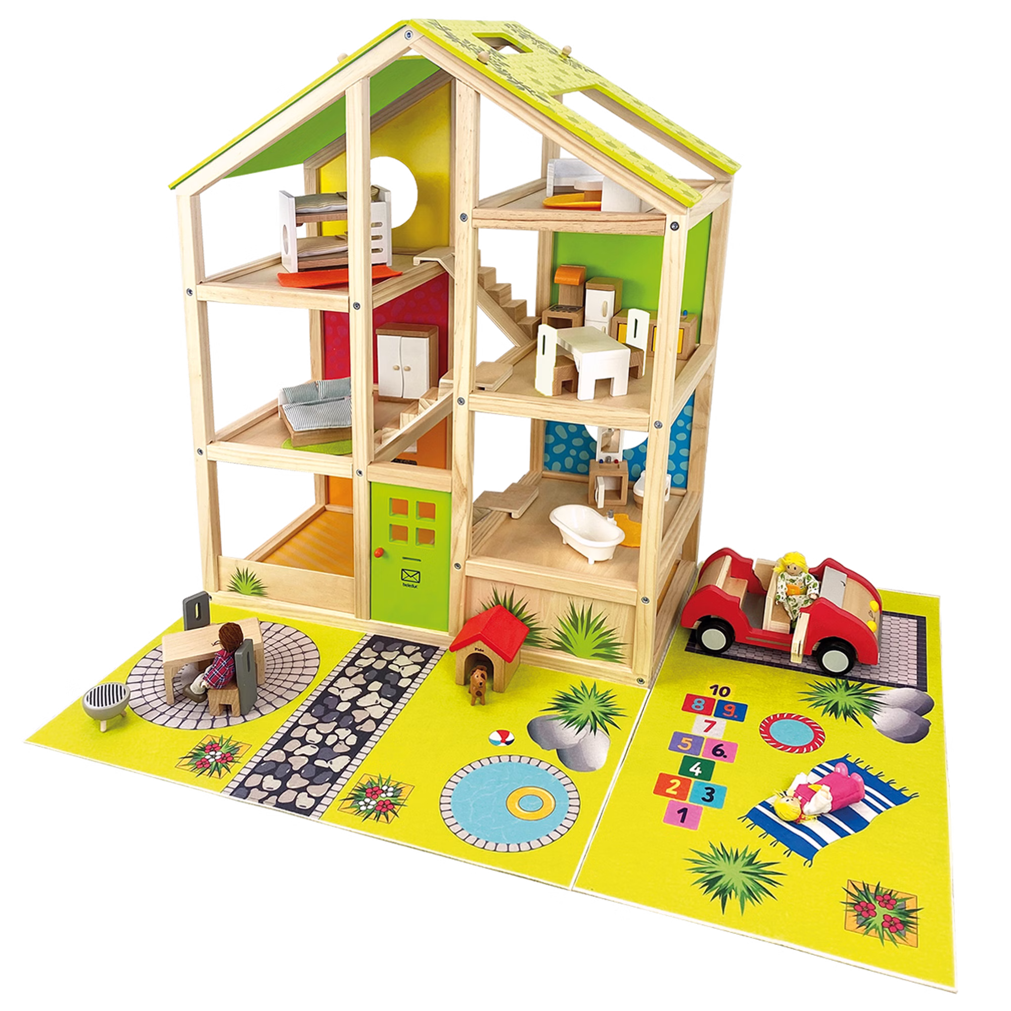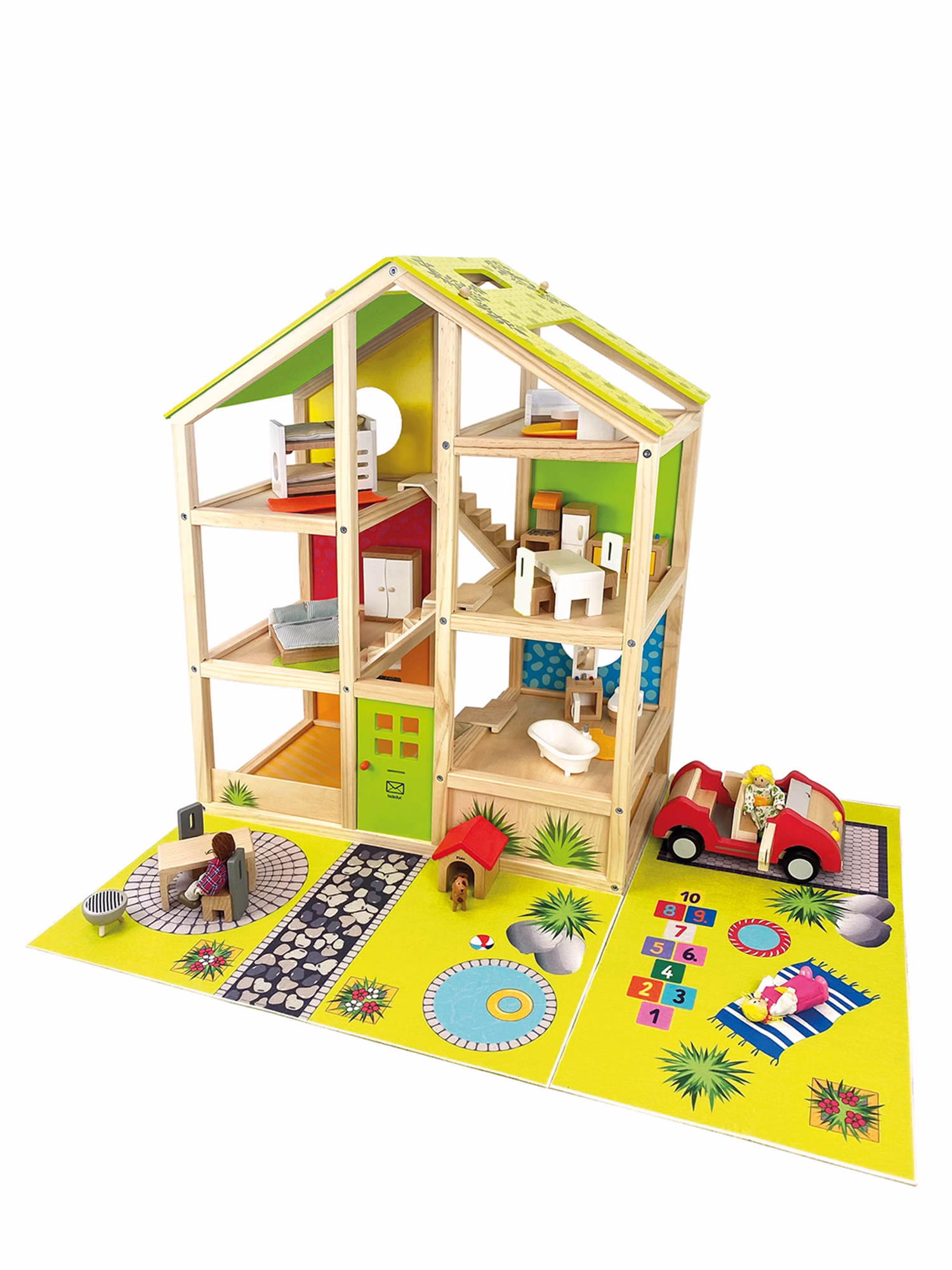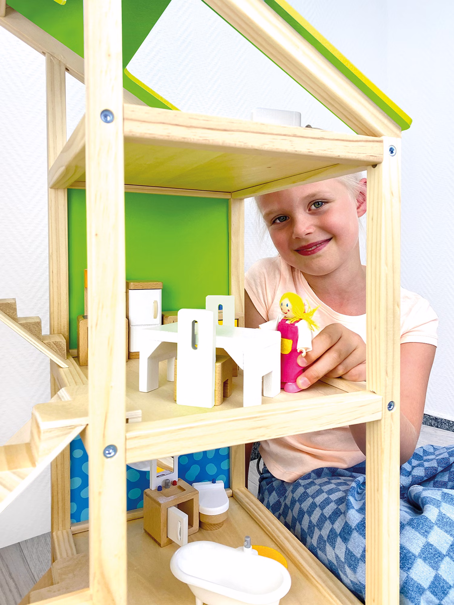 Dieses mehrstöckige Puppenhaus steht bereit für lustige Rollenspiele. Das Haus besteht aus sechs unterschiedlichen Zimmern, versetzbaren Treppen, einem Solarpanel auf dem Dach und einem großen bespielbaren Außenbereich.