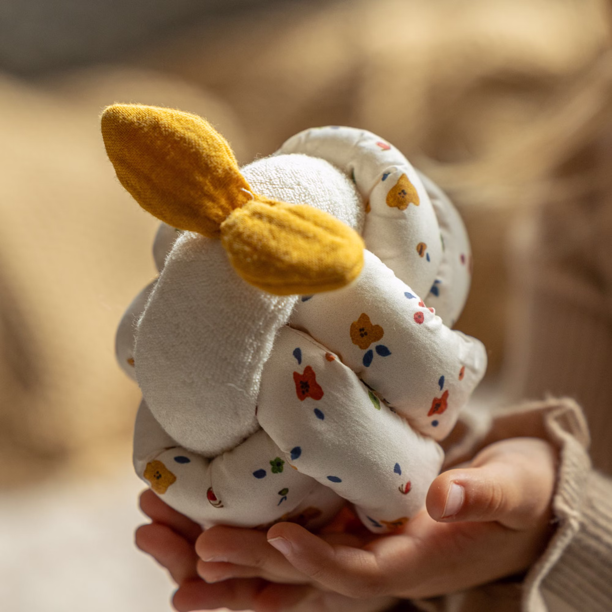 Mit dem Knotenball ist Spielspaß garantiert! Die weichen, ineinander verknoteten Ringe aus Strickfrottee lassen sich von kleinen Händen leicht halten und erkunden. Mit dem fröhlichen Käthe Kruse Wald-Print und der süßen Schleife aus ockerfarbenem Baumwollmusselin wird der Ball zu einem echten Hingucker.
